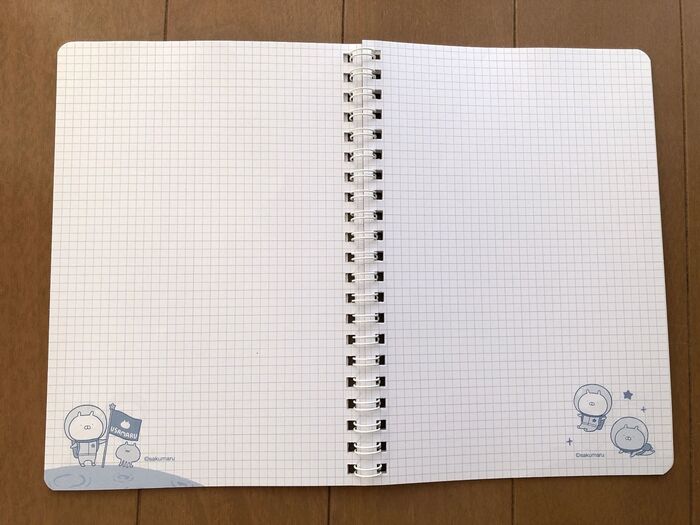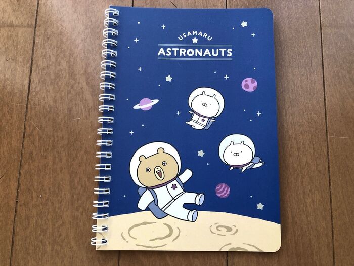 また、リングノートも一緒に購入してきました。宇宙イメージのデザインで、ノートの中にもしっかりうさまるが。サイズはB6で価格は110円でした。