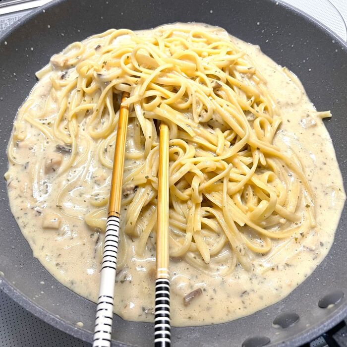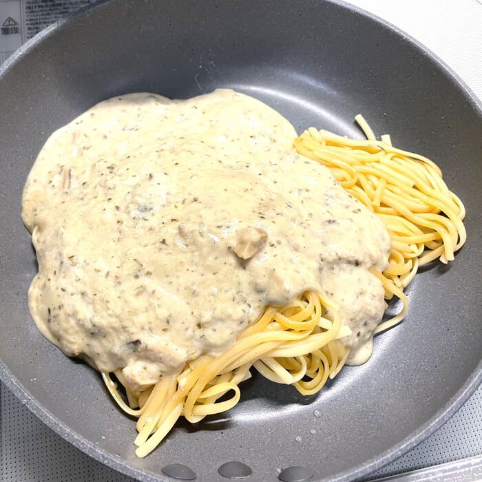 レシピ通り、フライパンに麺とソースを入れて強火で1分半混ぜましょう。