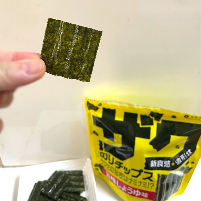 一般的なポテトチップスは1袋500kcalくらいありますが、こちらののりチップスなら27kcalと比べ物にならないほどヘルシー!