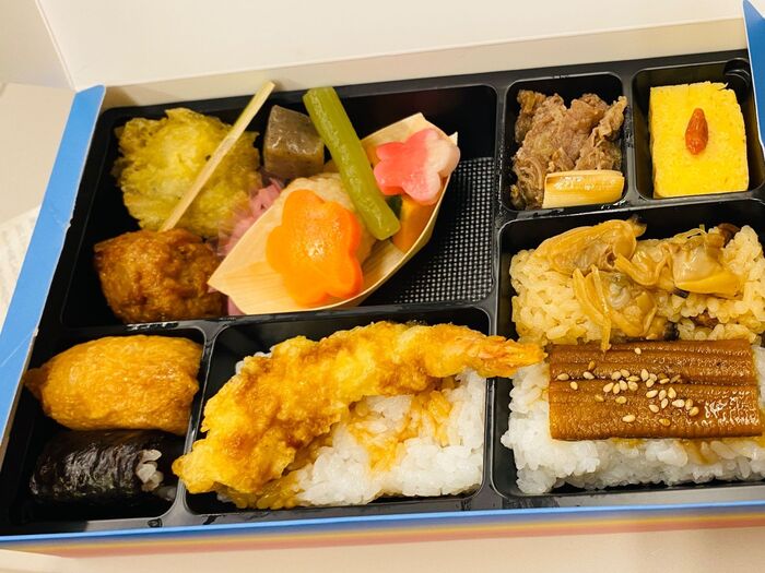 つくねやおいなり、かんぴょう巻き、海老天丼、あさりごはん、穴子丼、卵焼き、焼肉、煮物などが入っていました。1080円です。