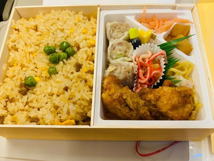 焼き豚炒飯に、崎陽軒の焼売が3個、鶏唐揚げが2個、塩焼きそば、メンマ、紅生姜がついて1050円