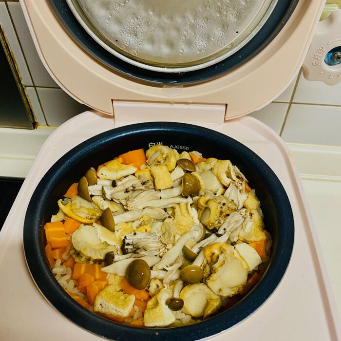 炊き込みモードまたは炊飯モードで炊きます。炊き上がったら、底側からヘラで切るように混ぜます。
