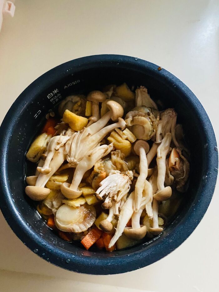 短冊切りにしたにんじん、石づきをとって手で割いたしめじ、油抜きをして細く切った油揚げ、ベビーホタテを入れます。