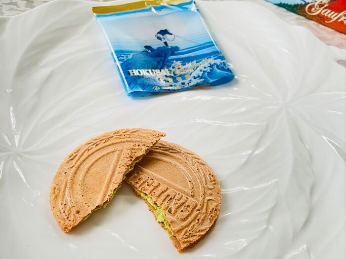 抹茶クリームが入ったゴーフレットです。