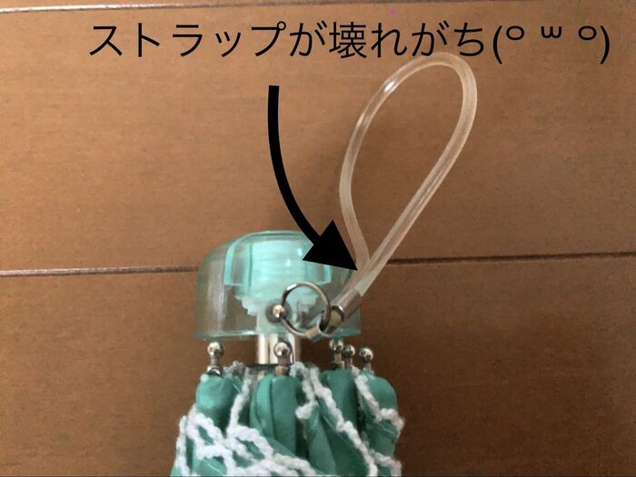 私だけかもしれませんが、折りたたみ傘をストラップの部分で指に引っ掛けて持っていると、もれなく壊れてしまうんです…( ̄▽ ̄)傘が壊れていないのに「ここか…」と残念な気持ちになります。