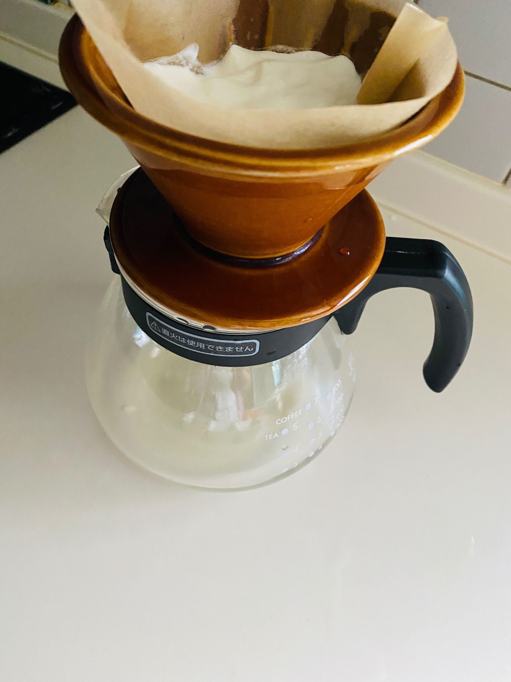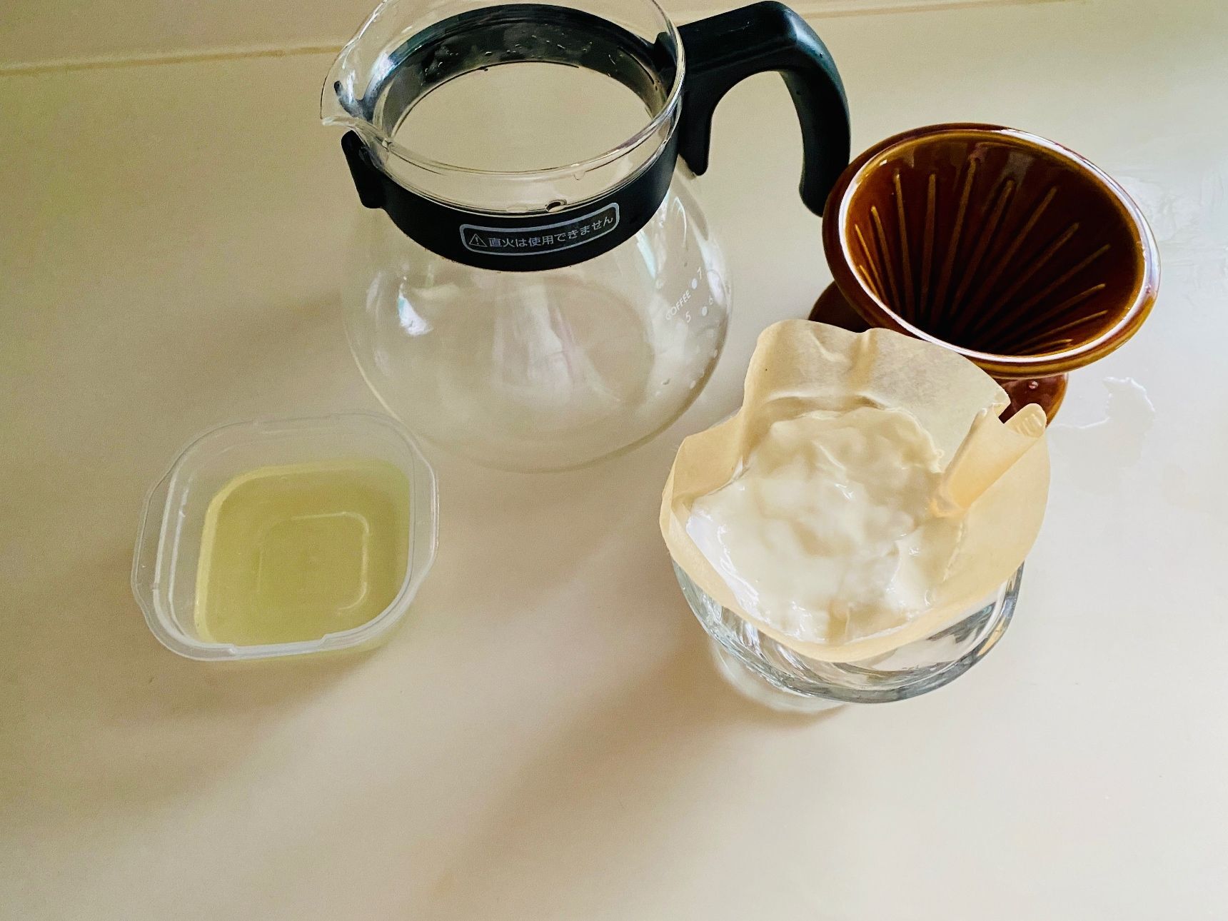 ①レギュラーコーヒーを作るように、ドリッパーにフィルターをセットしてプレーンヨーグルトを入れ、水切りします。
