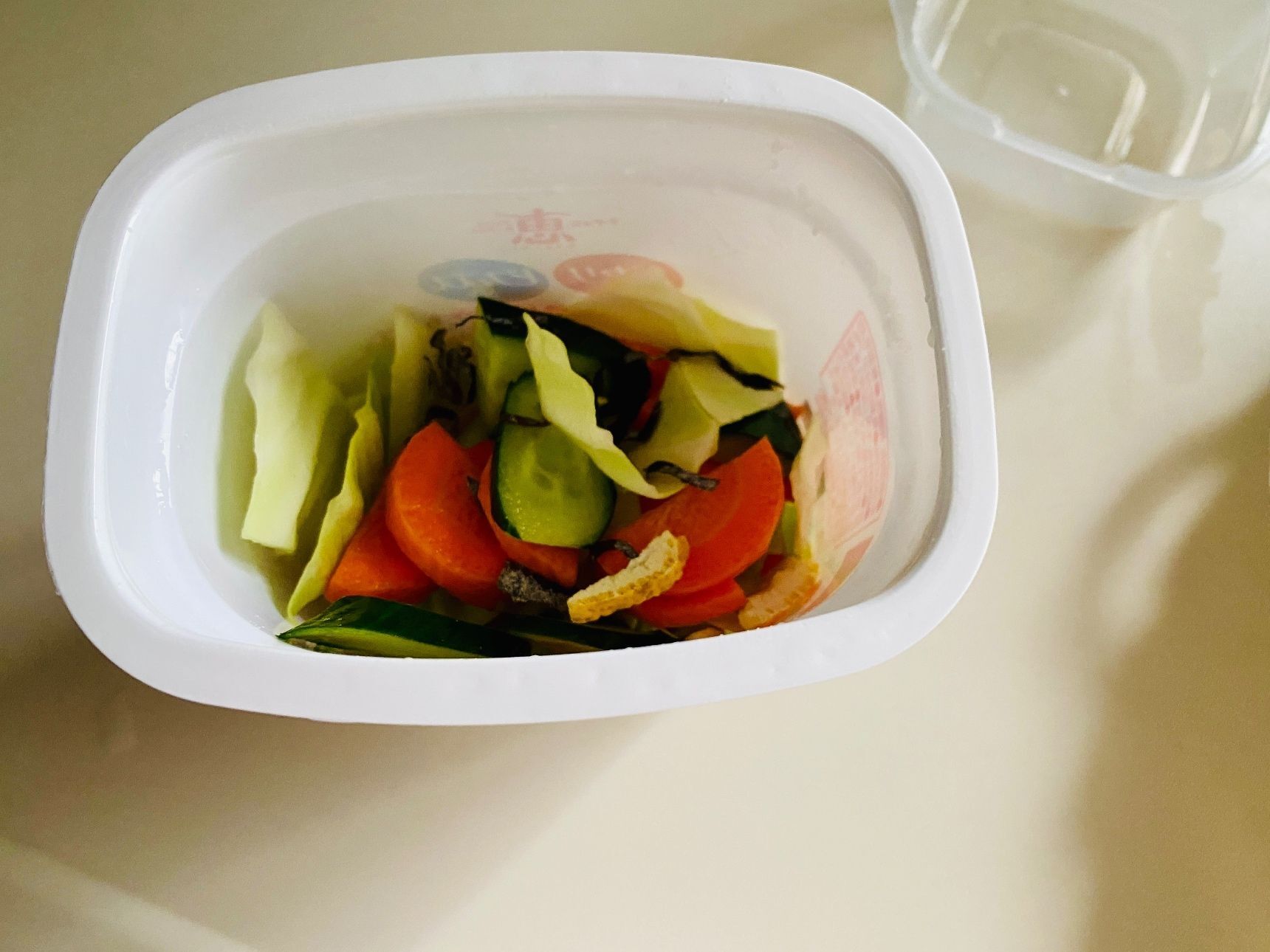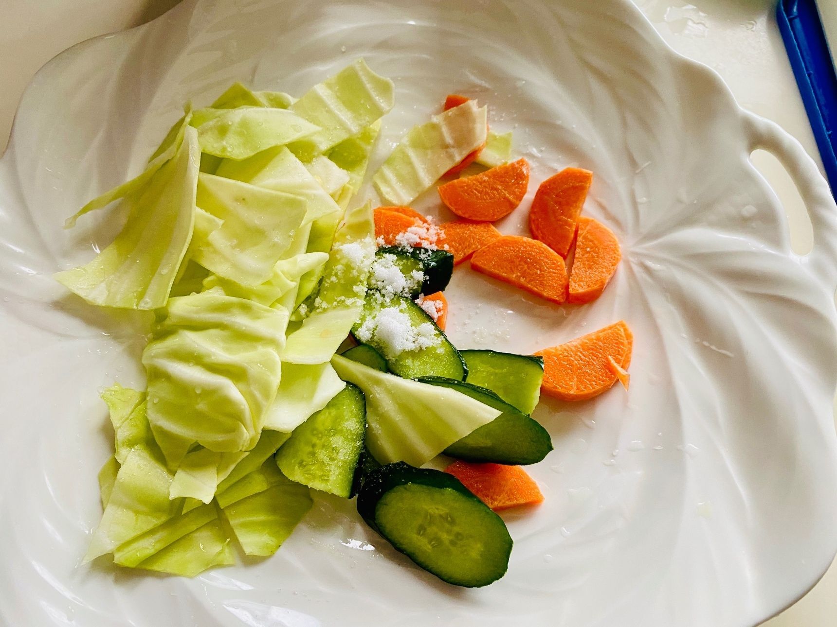 ④キャベツはざく切り、きゅうりは斜めスライス、にんじんは半月切りにします。