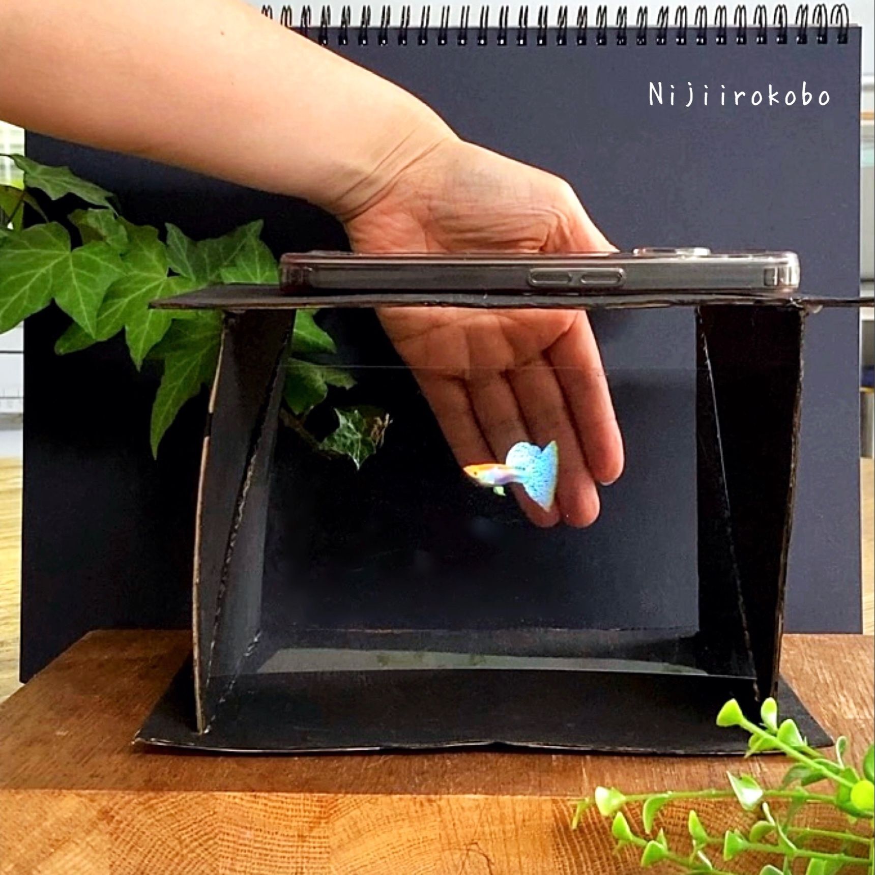必ずしも色を塗る必要は無いのですが、箱全体を絵の具で黒く塗ると、ホログラムがより鮮明に美しく見えます。