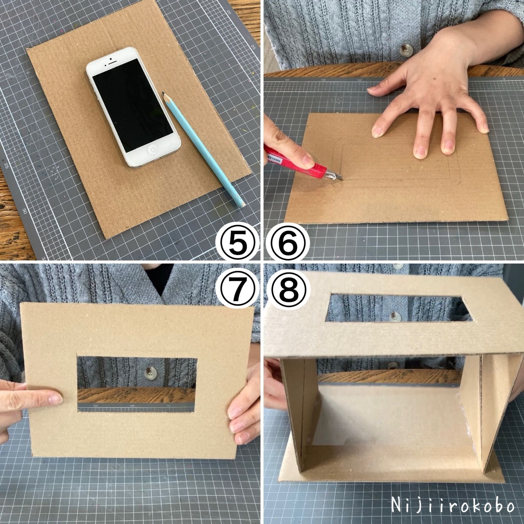 5. カッターで、実際のスマホのサイズよりも1㎝ほど小さめの四角を切り取り、穴をあける。(写真⑥⑦)