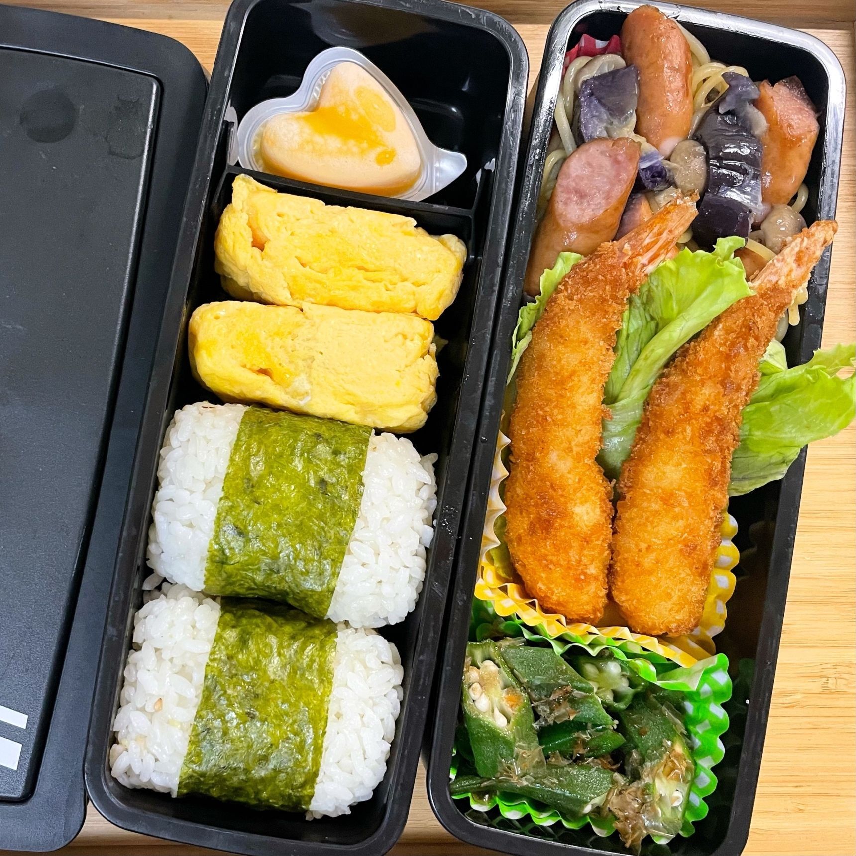 俵おにぎりにして、エビフライと合わせてみました。