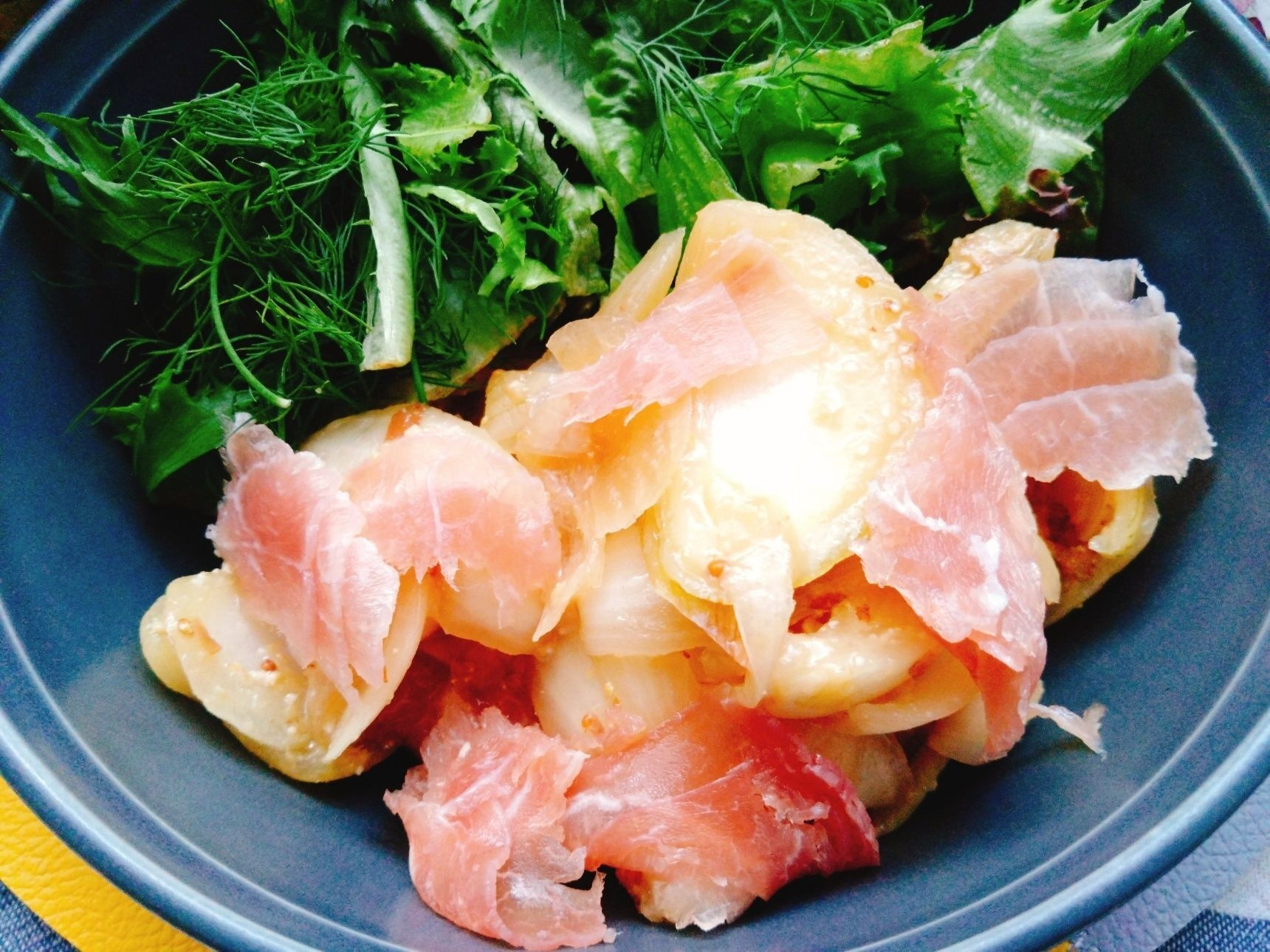 2.お好み量の1と生ハムを混ぜ葉野菜と盛り付けたら完成