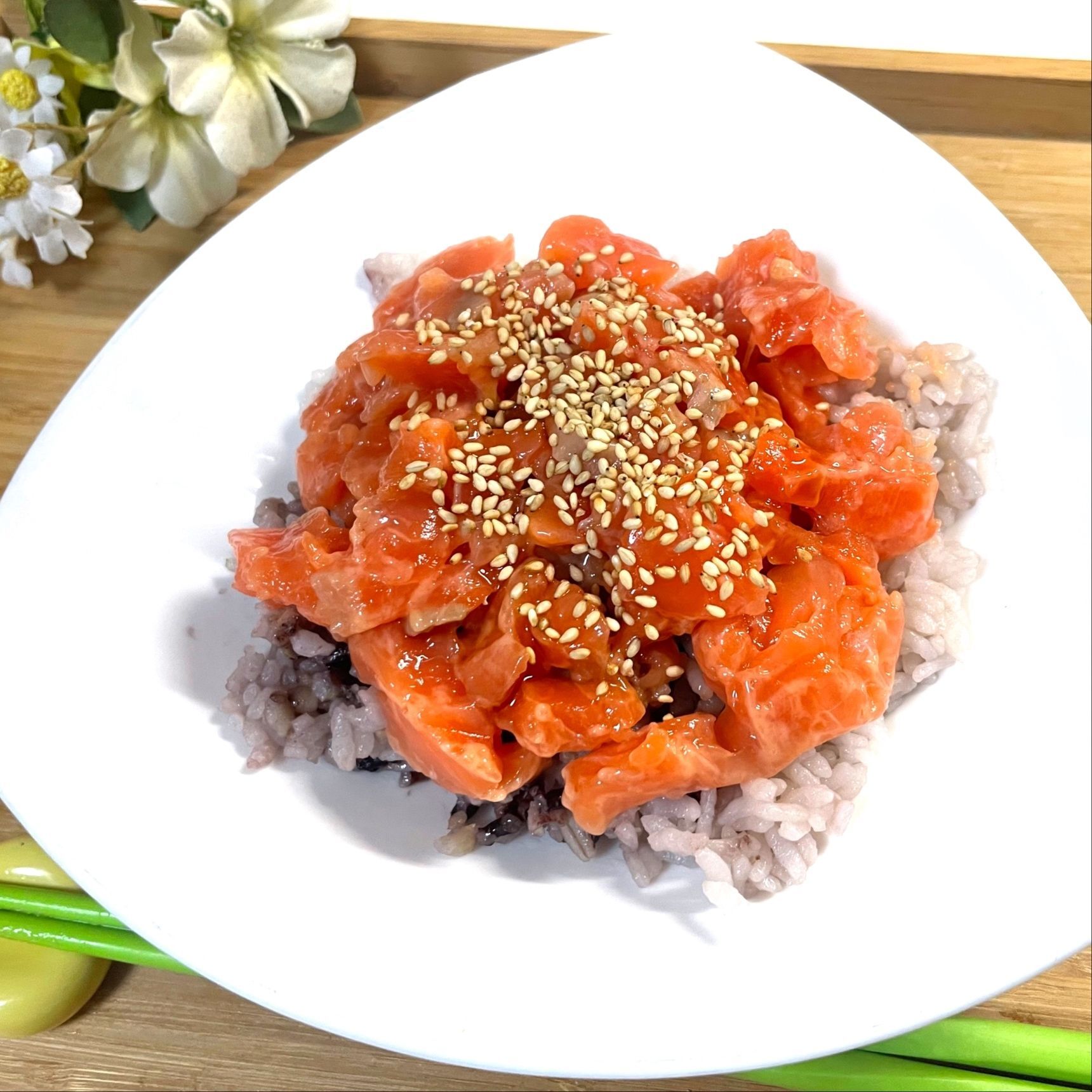 ごはんにタレを半分かけた上にサーモンを乗せて、仕上にもう半分をかけました。