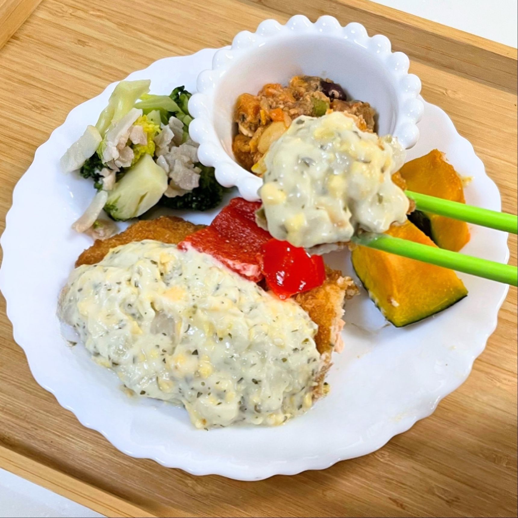 フライを解凍するとベチョッとしそうなので、レンチンした後にサーモンフライだけトースターでカリっと仕上げました。