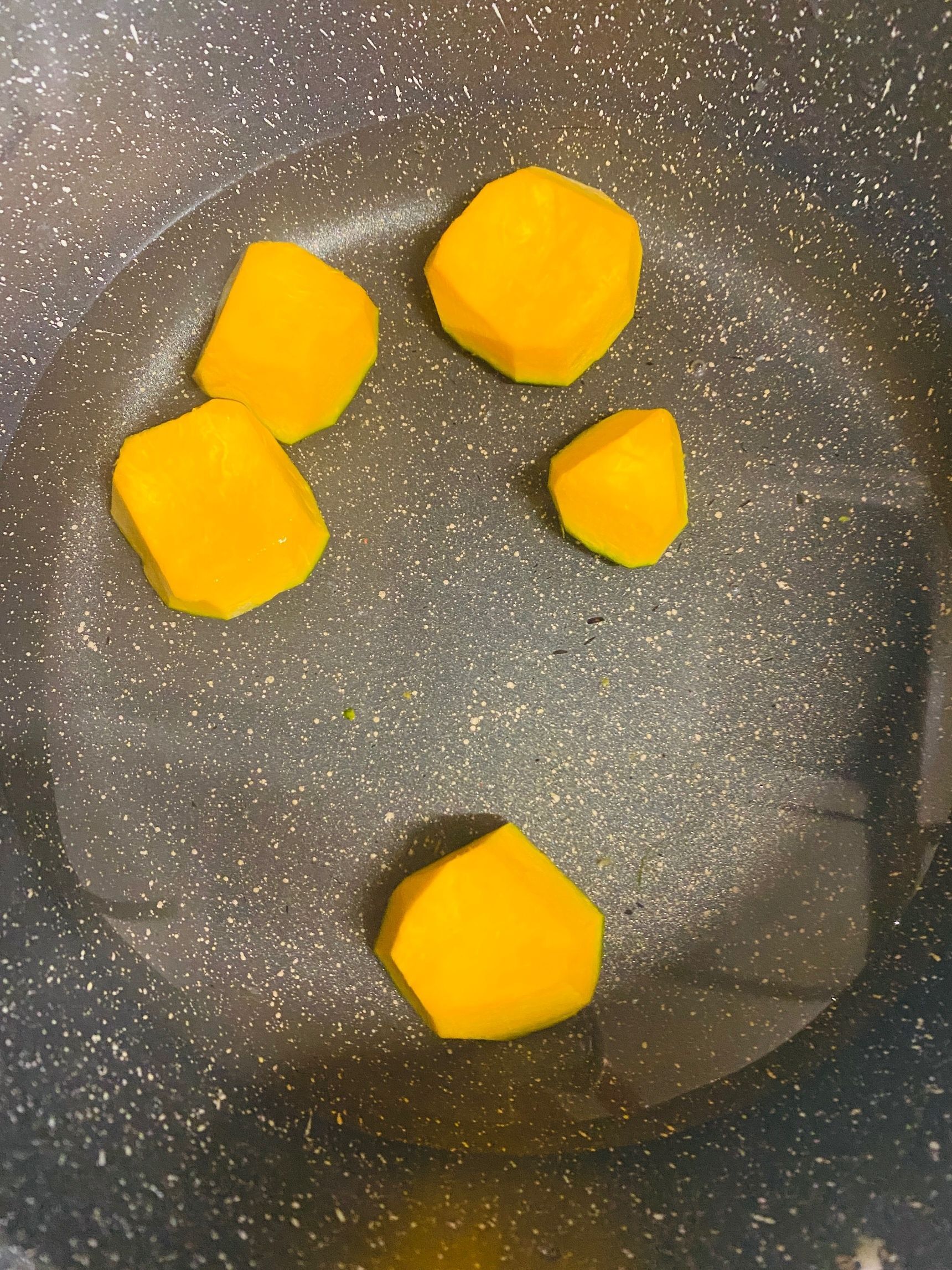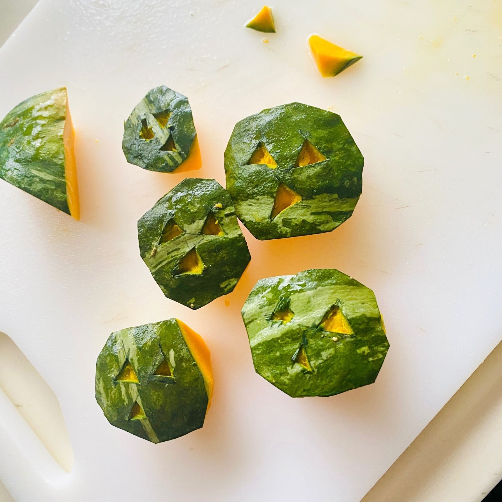 ⑨ かぼちゃを一口大に切って、ジャック・オー・ランタンのように飾り包丁を入れます。