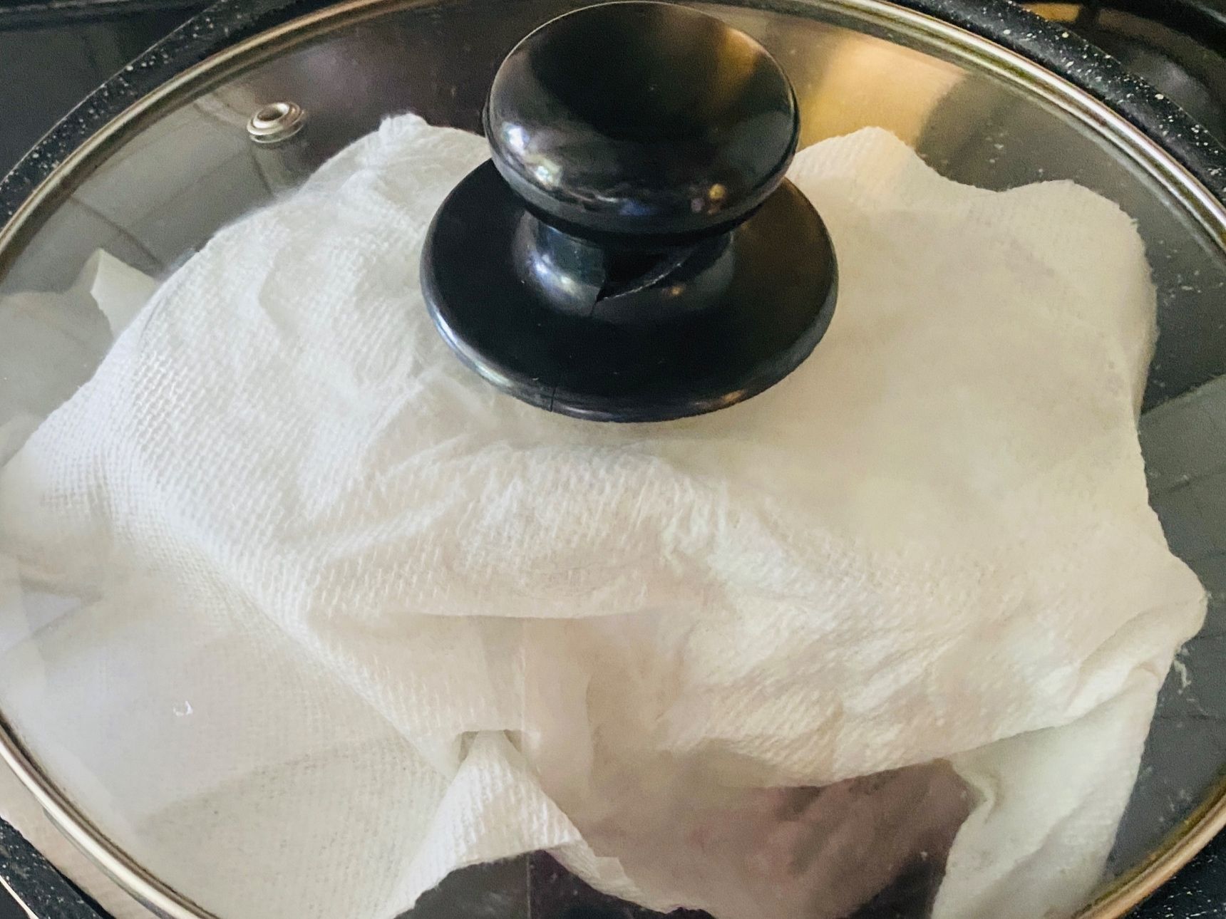 ⑦ 濡れ布巾をかけて、蓋をして、弱火で20分ぐらい加熱します。加熱時間は調整して下さい。火を止め、粗熱が取れるまでそのまま放置します。