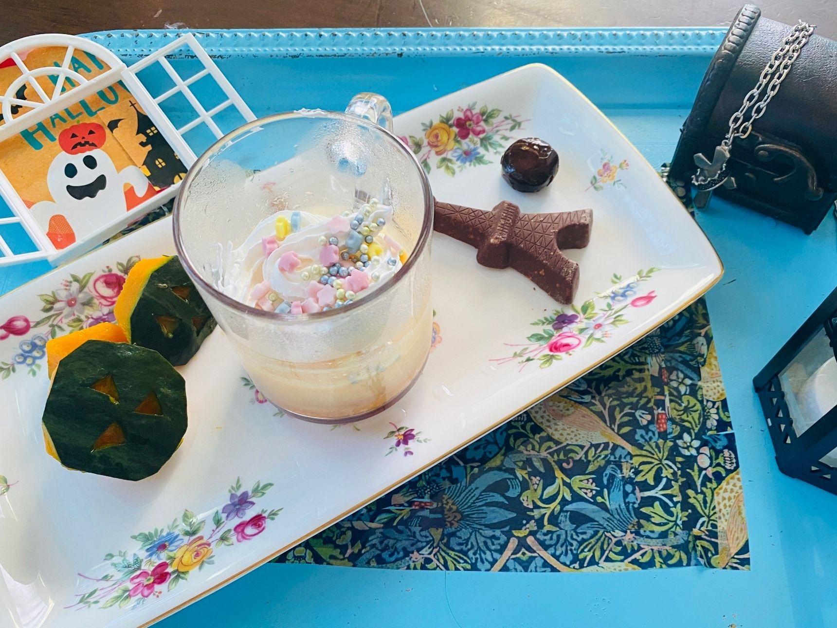 器にのせて、ジャック・オー・ランタンのかぼちゃや、家にあったチョコレートなどを飾りました。