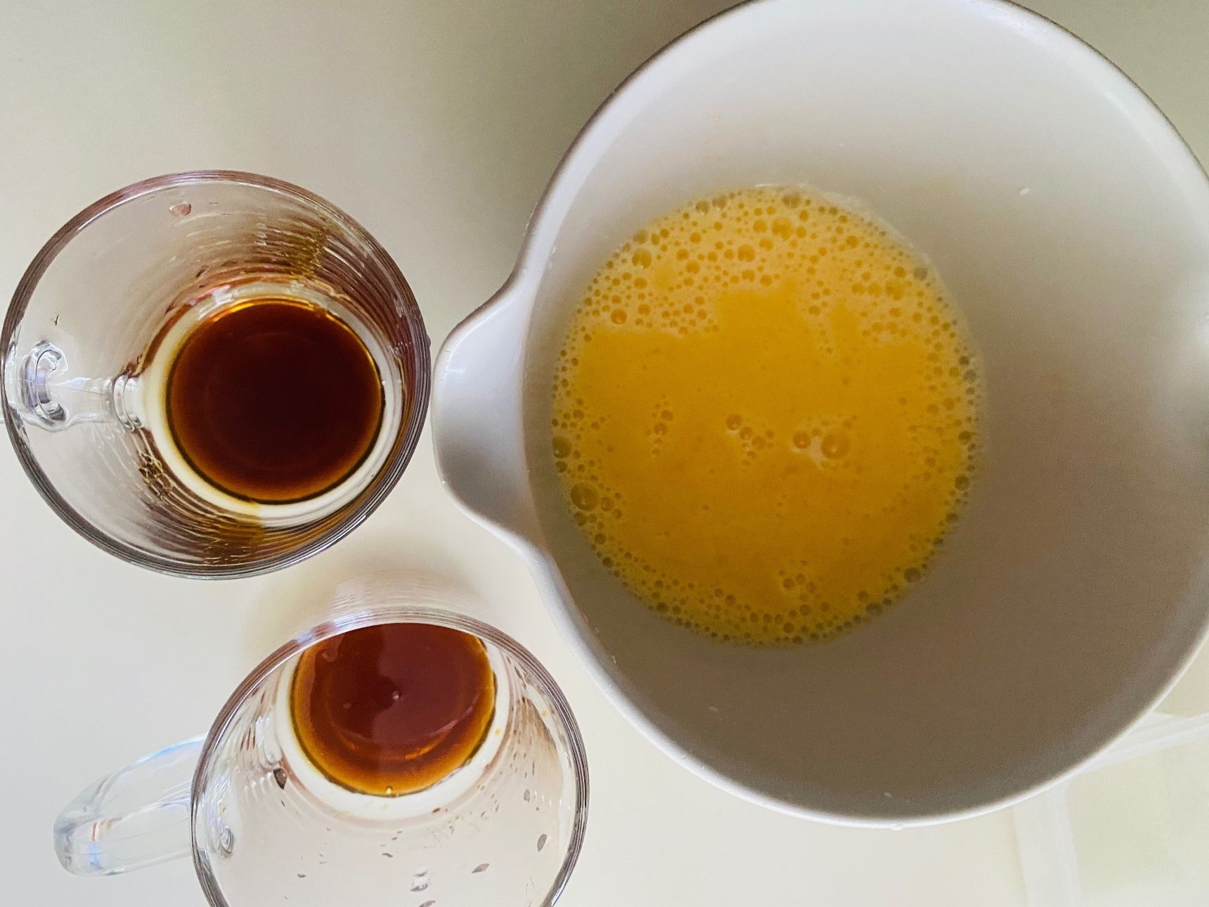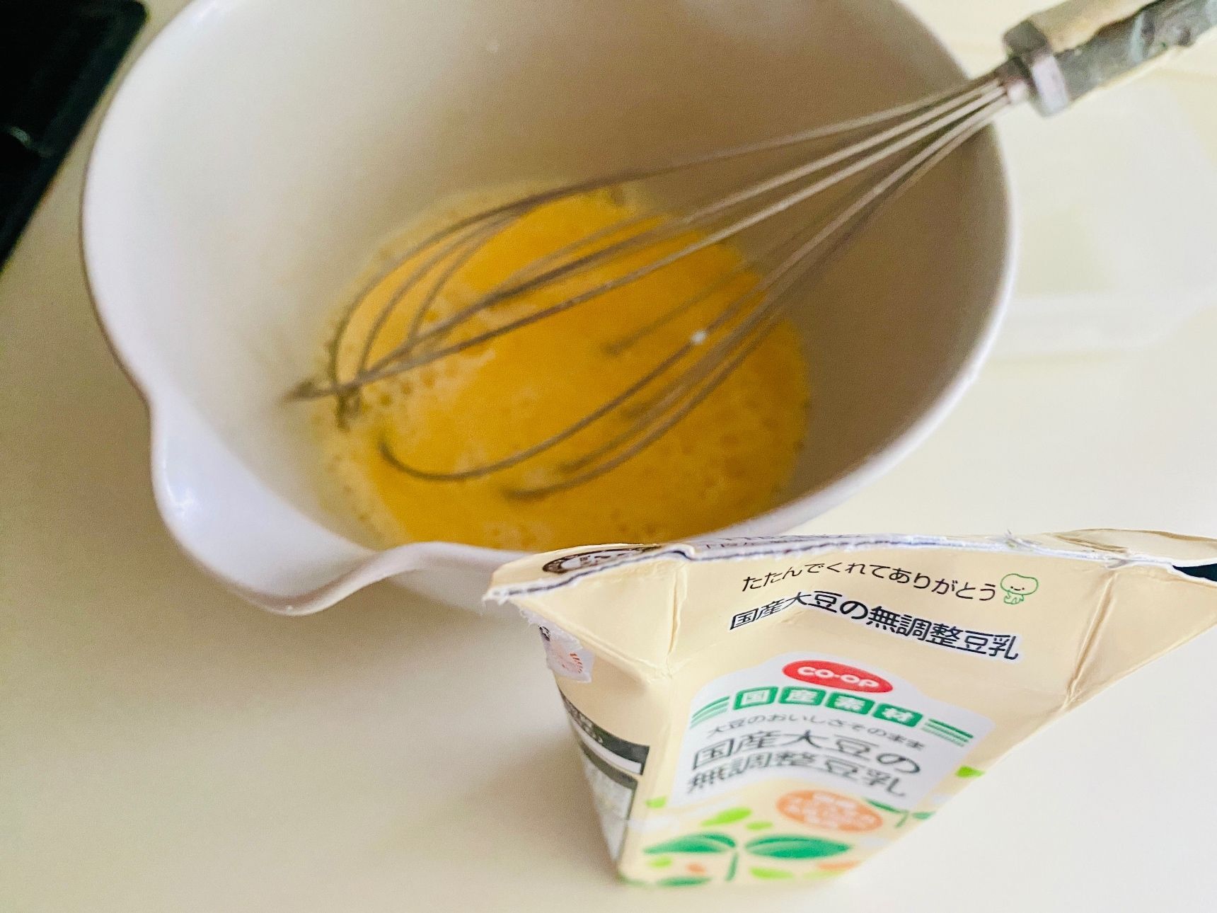 ③ ボウルに、卵を割り入れよく混ぜます。砂糖を加え、さらによく混ぜます。②のホエーを入れよく混ぜます。豆乳を加えよく混ぜます。