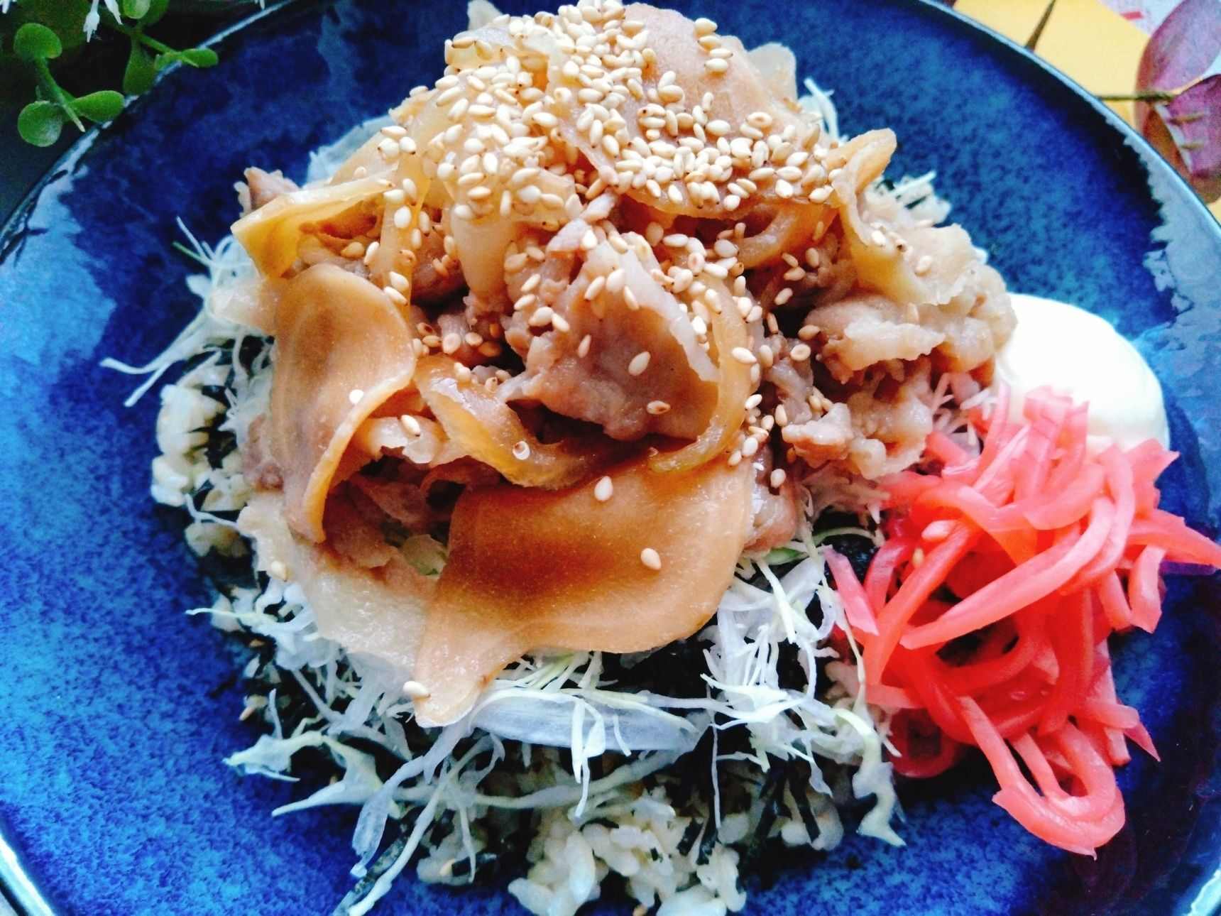 3.ご飯の上に刻みのりを散らしてキャベツと豚肉を盛り付け、マヨネーズ、白いりごま、紅生姜をトッピングして完成