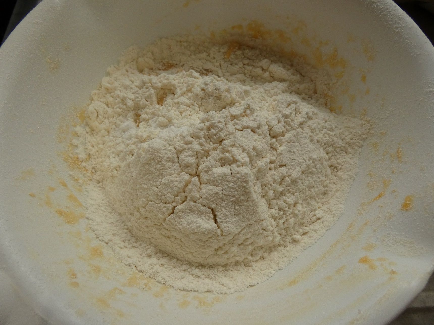 薄力粉とベーキングパウダーをふるいにかけていれ、混ぜ合わせます。
