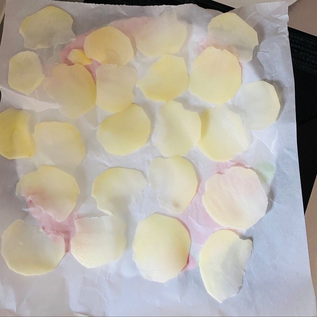 じゃがいもは皮を剥き、スライサーでスライスします。 水に浸してアクを取ります。 よく水気を切ります。 キッチンペーパーでよく拭き取ります。 クッキングシートに並べて、電子レンジ500Wで5分加熱します。 塩胡椒して出来上がり!