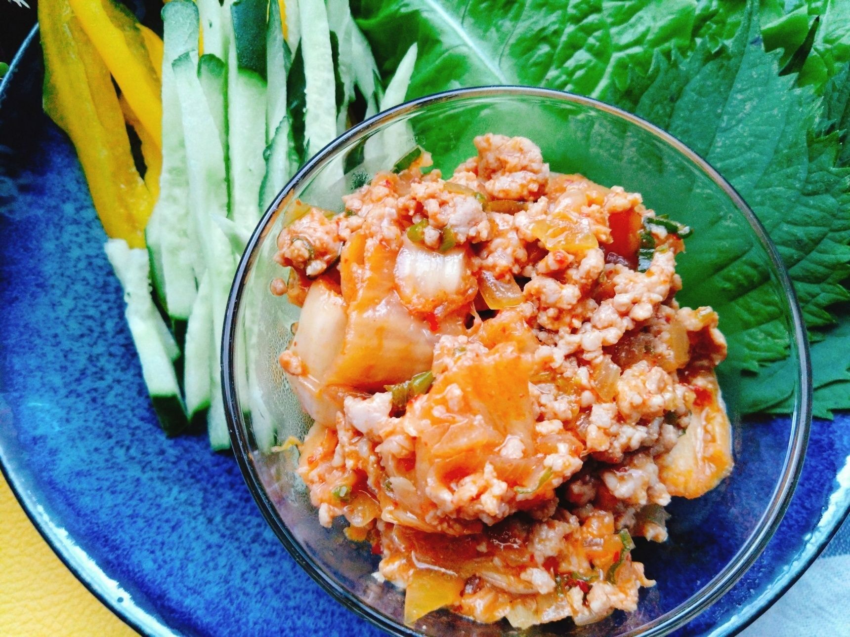 色が変わってきたらキムチを加え、水分を飛ばしながら炒める。