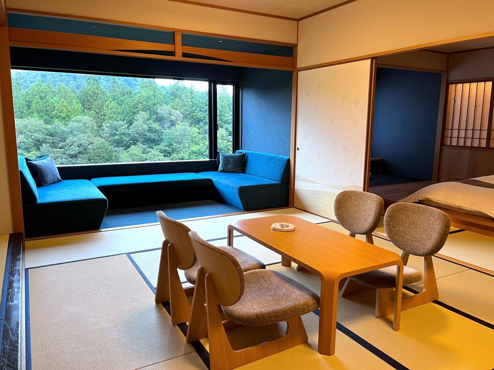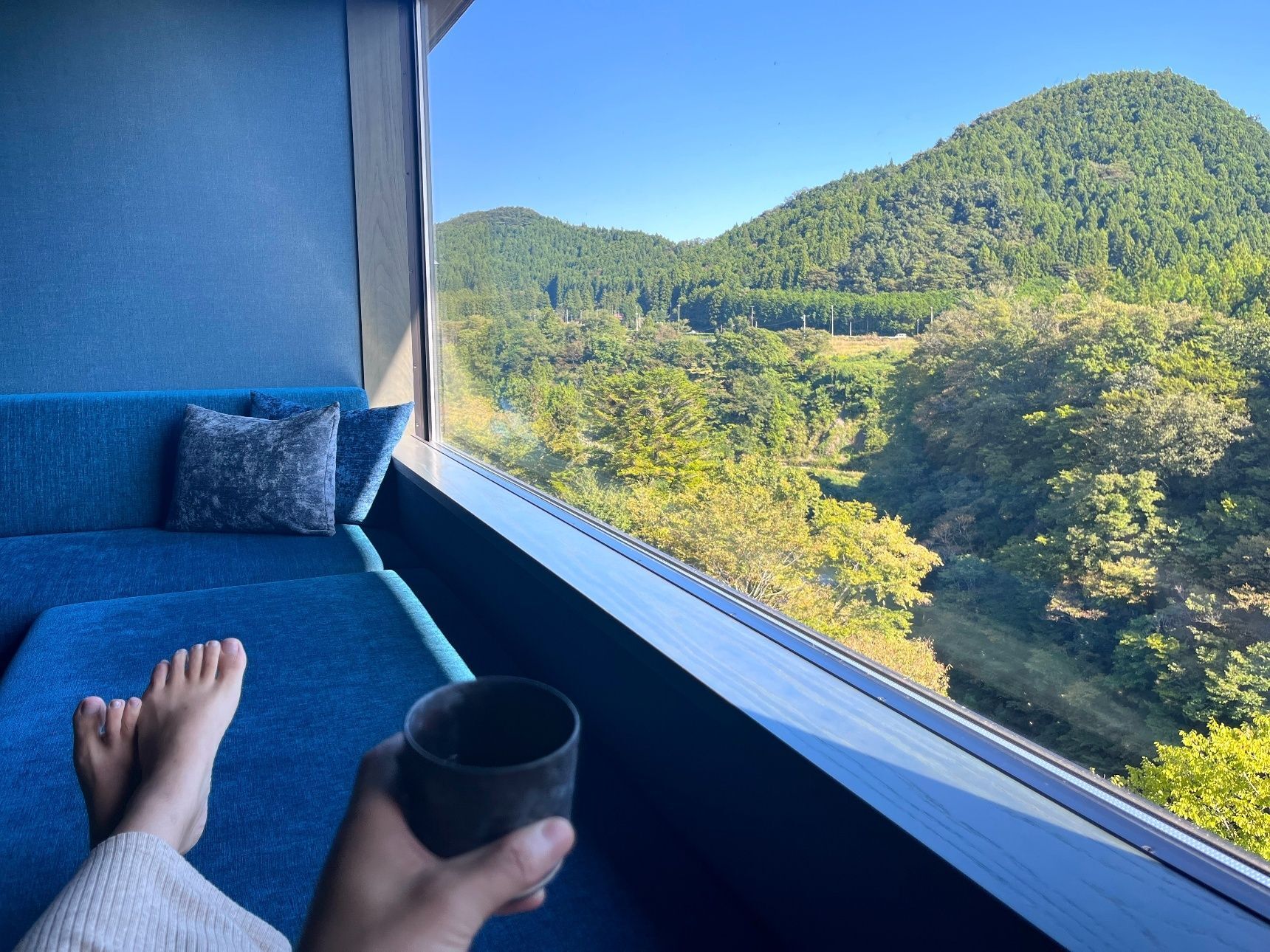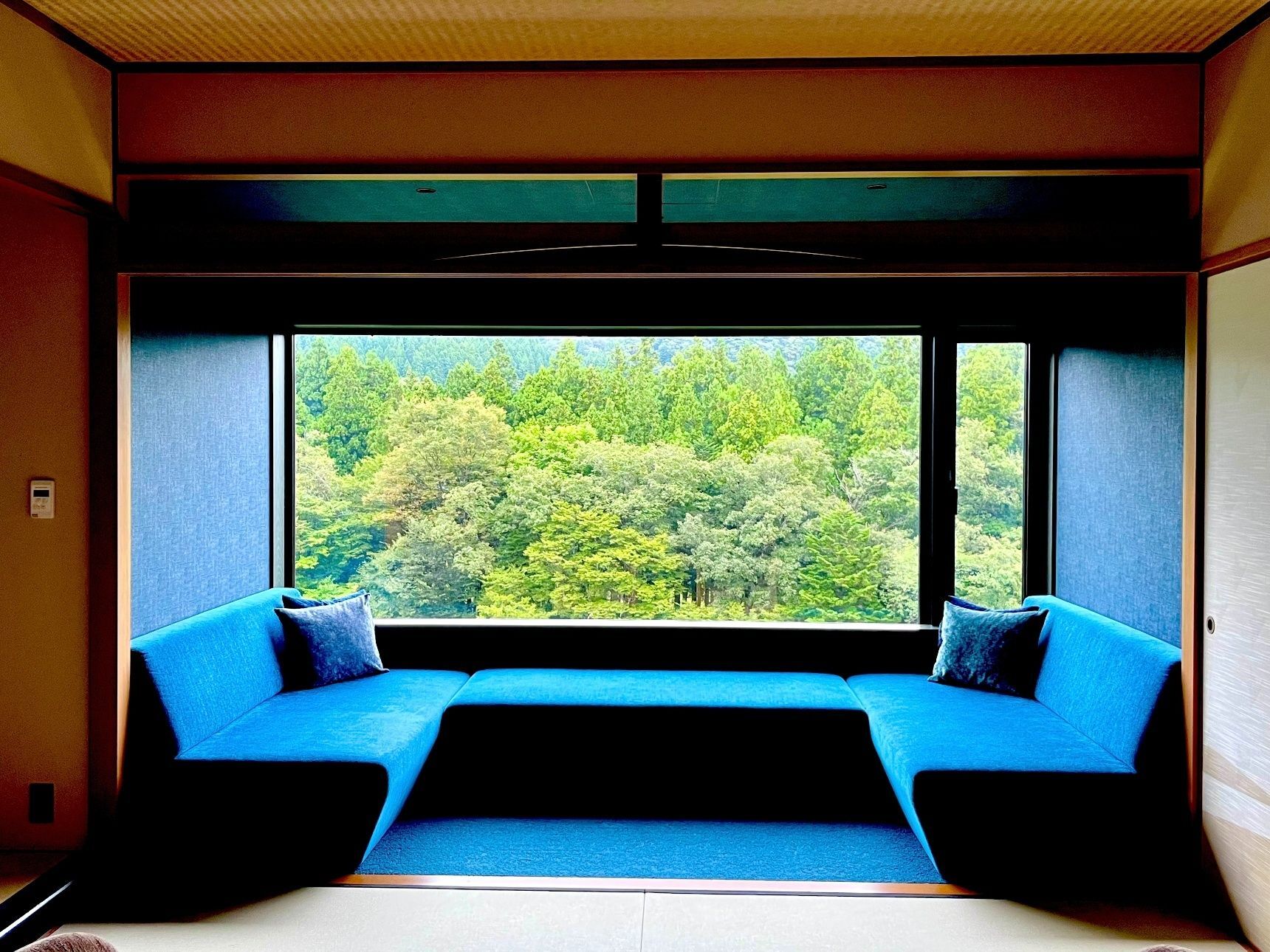 客室はすべて伝統工芸を取り入れたご当地部屋。宿泊した「紺碧の間」では、目の前に再び、森の借景が。界 秋保はどの客室も森が見えるつくりになっているそうです。