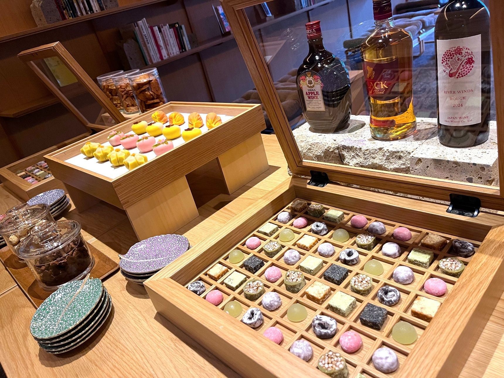 館内にはせせらきラウンジという宿泊者専用のラウンジがあり、季節の生菓子や仙台駄菓子がふるまわれています。コーヒーやハーブティーだけでなく、地元ワイナリーのワインやウイスキーまで…!