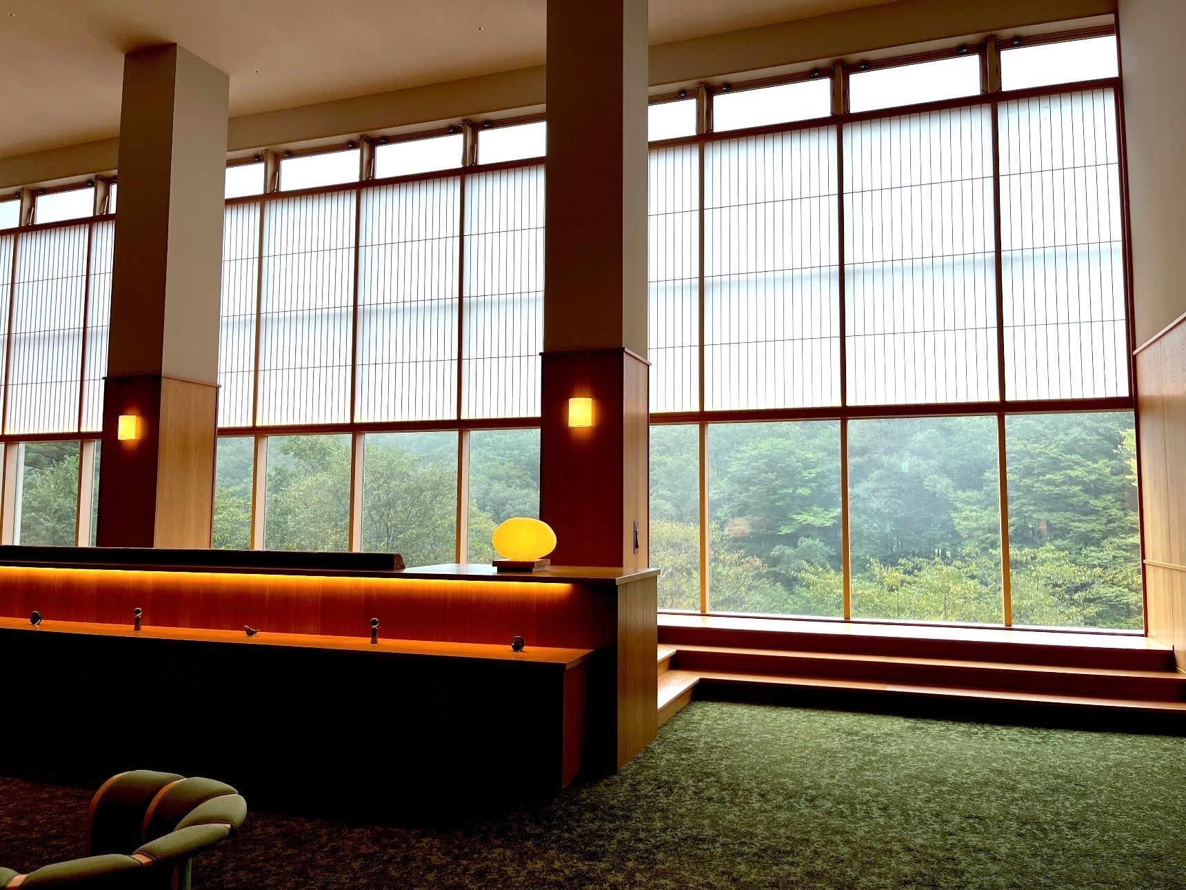 エントランスの自動扉をくぐった瞬間、目の前に広がるのはガラス越しに見える緑いっぱいの景色。森と名取川の借景に、忙しない日常で縮こまっていた心が一気にほどけていくようです。