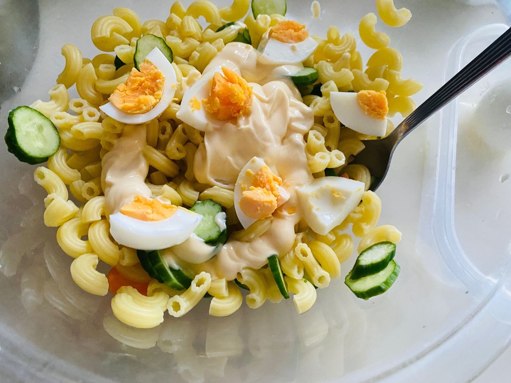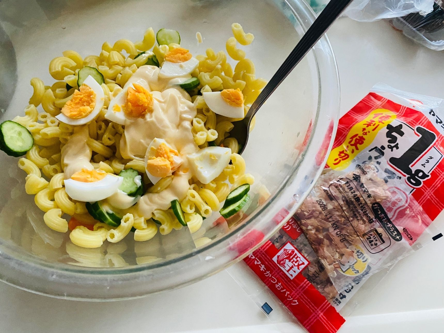 マカロニサラダにツナを入れて済むことかもしれませんが、ツナだと(美味しいですが)水っぽくなるので、鰹節だと水っぽくならずに、旨み成分たっぷりなので、美味しく仕上がりますよ。また、マスタードを入れると、ピリ辛になりますよ。