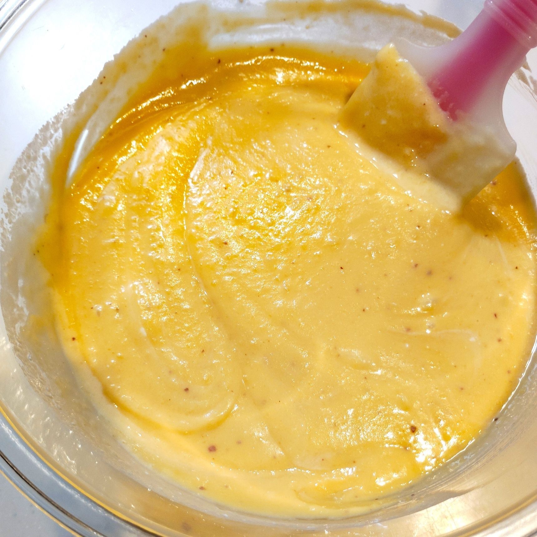 さつまいもの粗熱がとれたら、同じボウルに全ての材料を入れて、ハンドブレンダーでかくはんする。