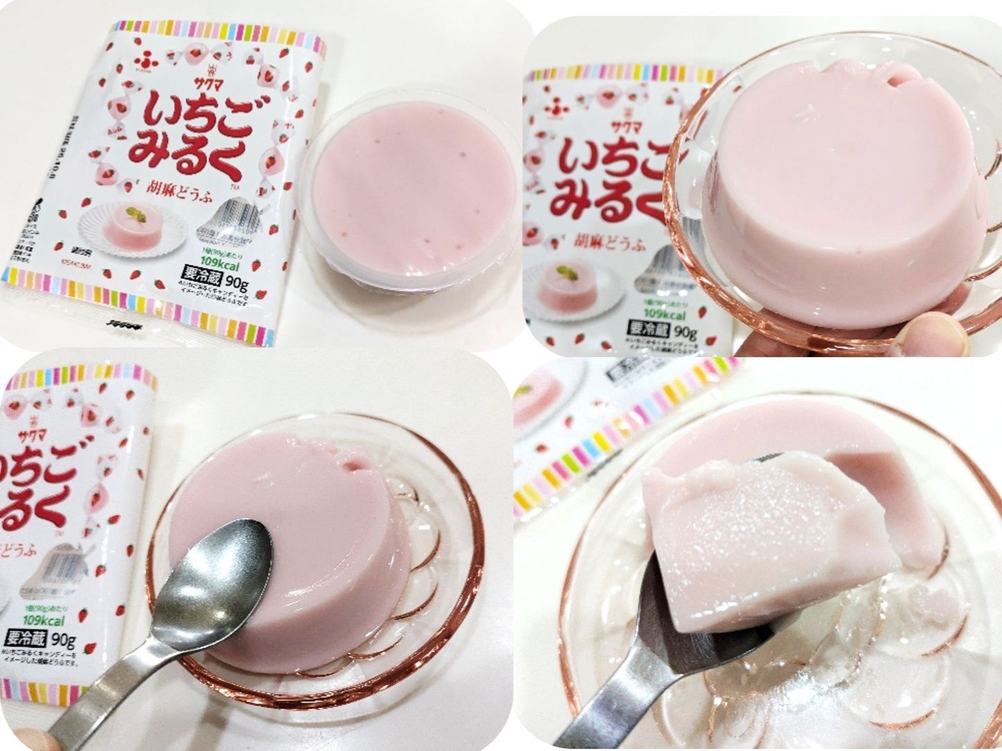 一口の中にもいちごみるくの洋の味わいから→白ごまの和菓子のような味わいに変化する感じが個人的にしました。全体的にやさしい甘さで美味しく、洋のような和のような不思議な感覚になりました。食感も少し伸びのあるようなちょっぴりねっとり食感が楽しいですね。