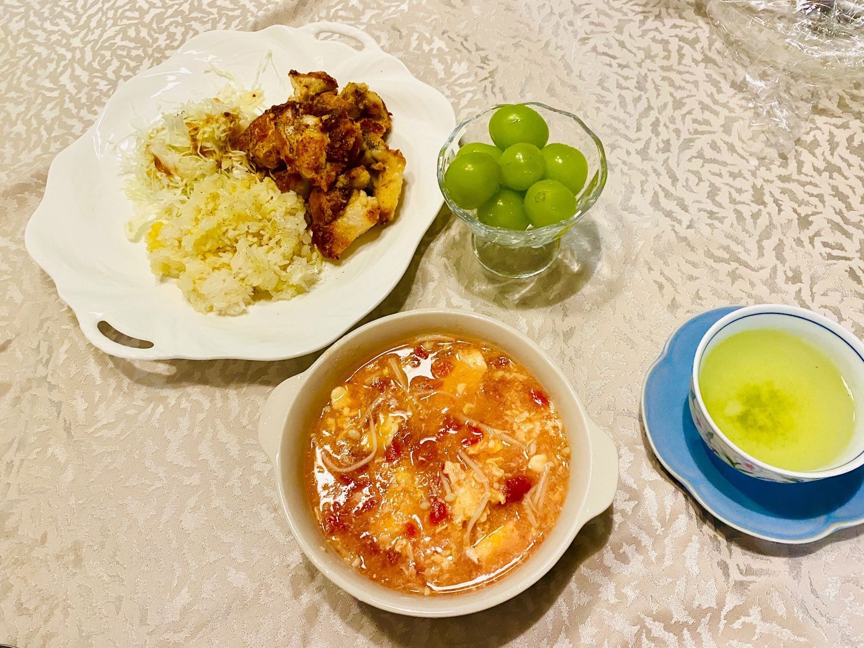 ガーリックバターライス、バジルチキン、トマトとえのきの卵スープを合わせてみました。