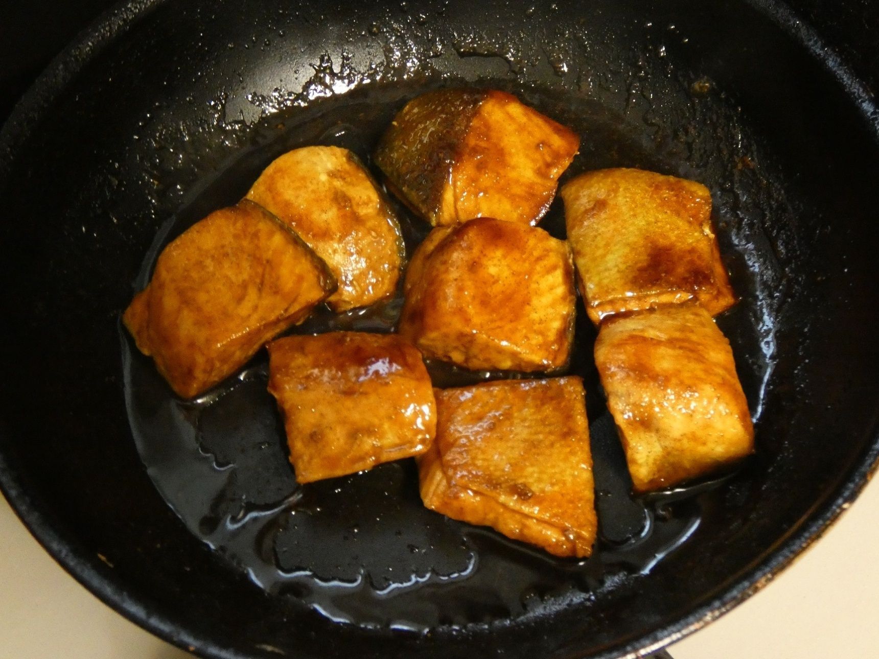 焼き色がついたら裏返し、フタをします。火が通ったらAを混ぜ合わせて入れ、全体にからめます。