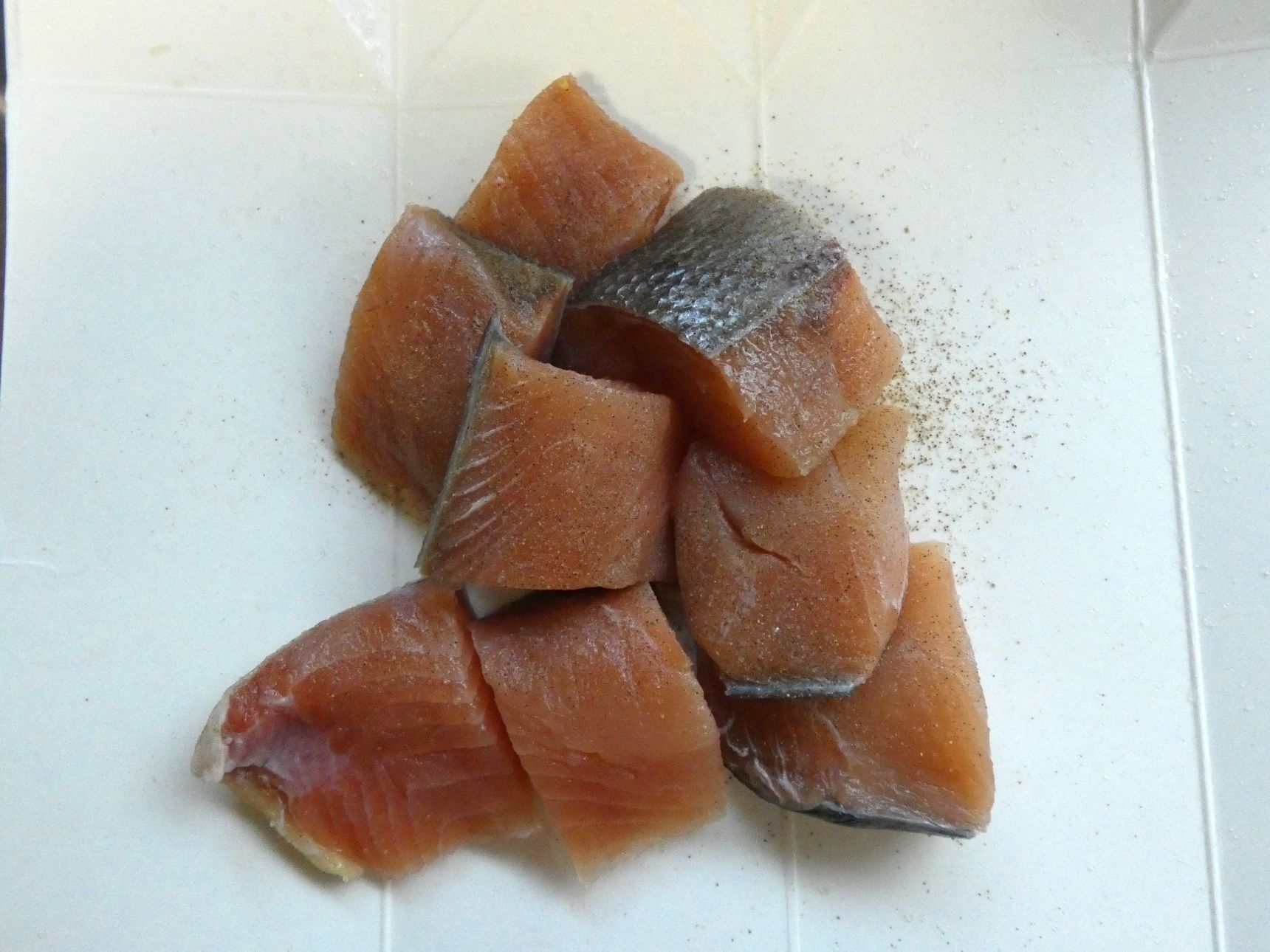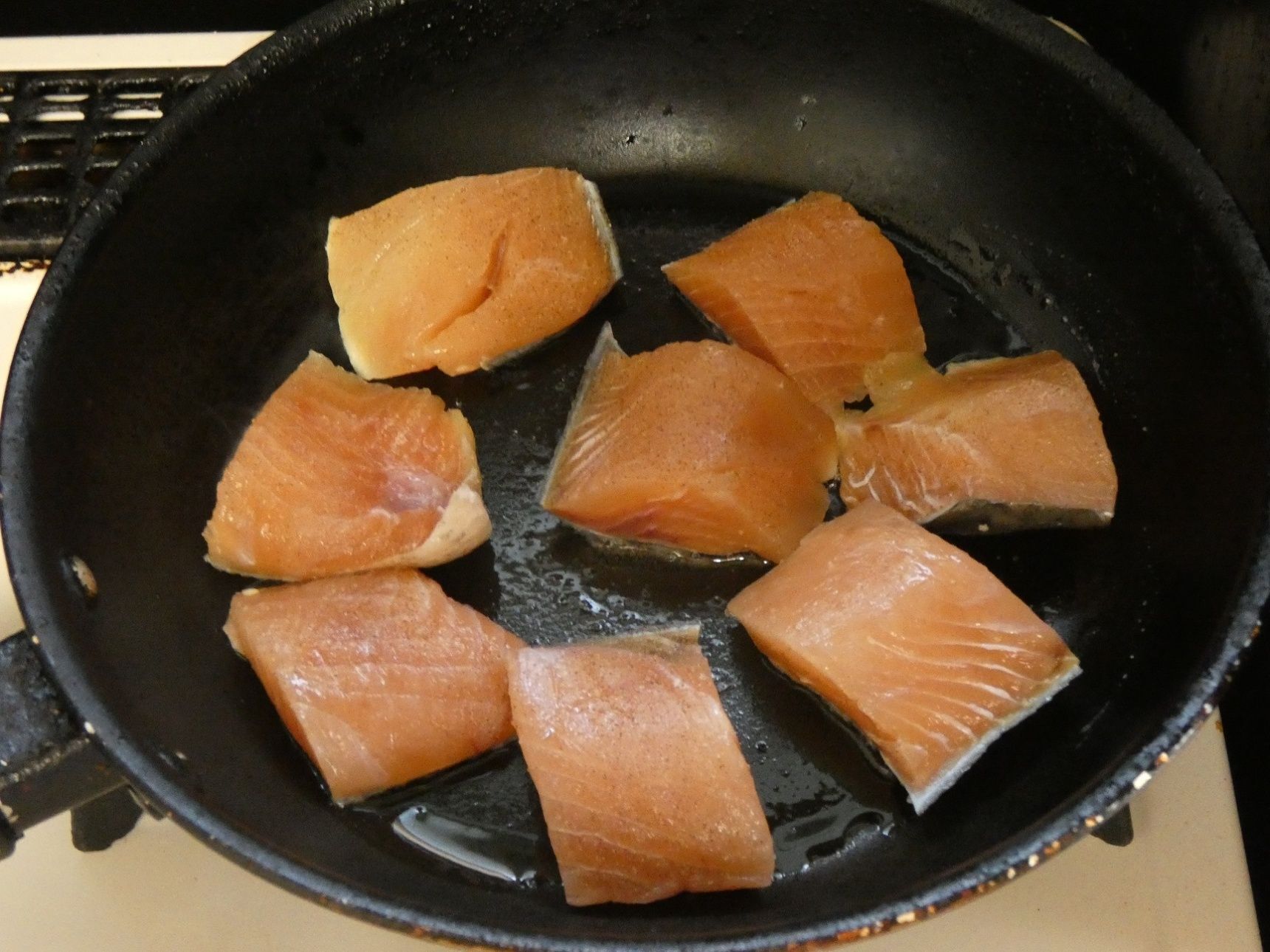 フライパンに油をひき、皮目を下にして生鮭を焼きます。