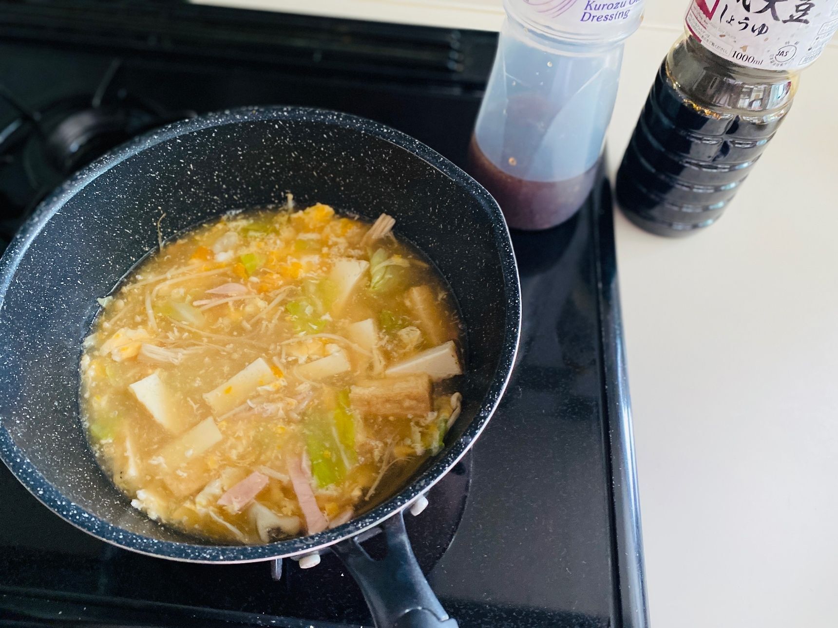 鍋に水、チキンスープ、水でささっと洗って手でちぎったキャベツ、石づきをとって手でバラバラにしたエノキ、短冊切りにした絹揚げ、短冊切りにしたハムを入れ火にかけます。