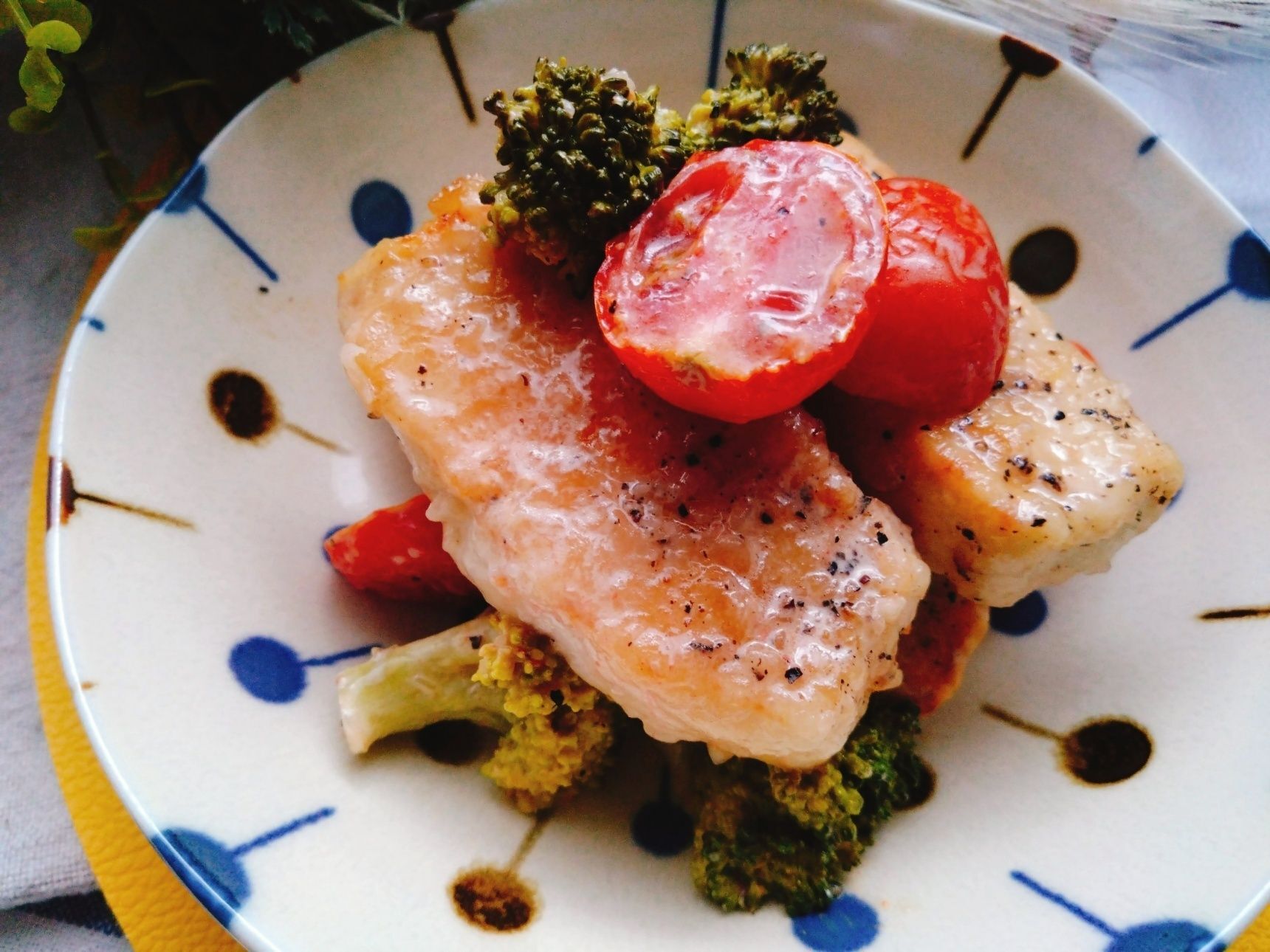 1.フライパンにこめ油を熱し、かじきを並べ両面白くなるまで焼く。端に寄せブロッコリーとミニトマトを入れて焼く