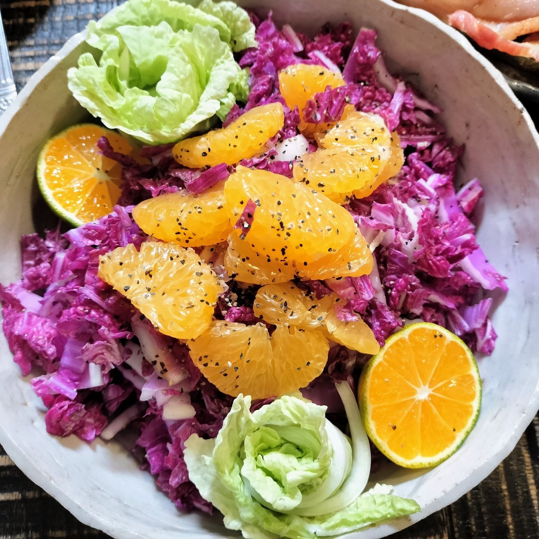 4. 白菜(白)の柔らかい黄緑色の部分を縦4等分に切る→2枚ずつ重ねてクルクル丸め、器に添える