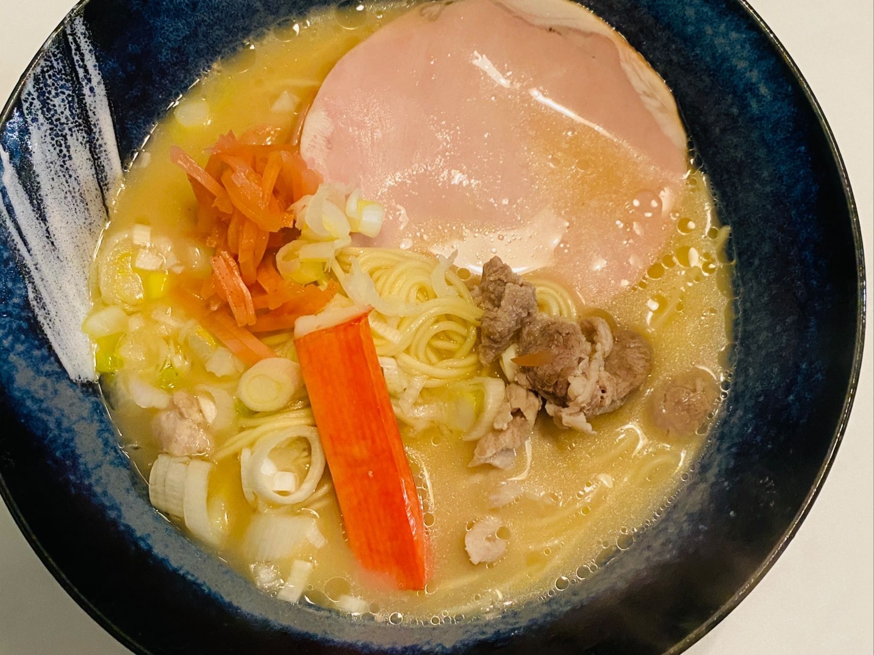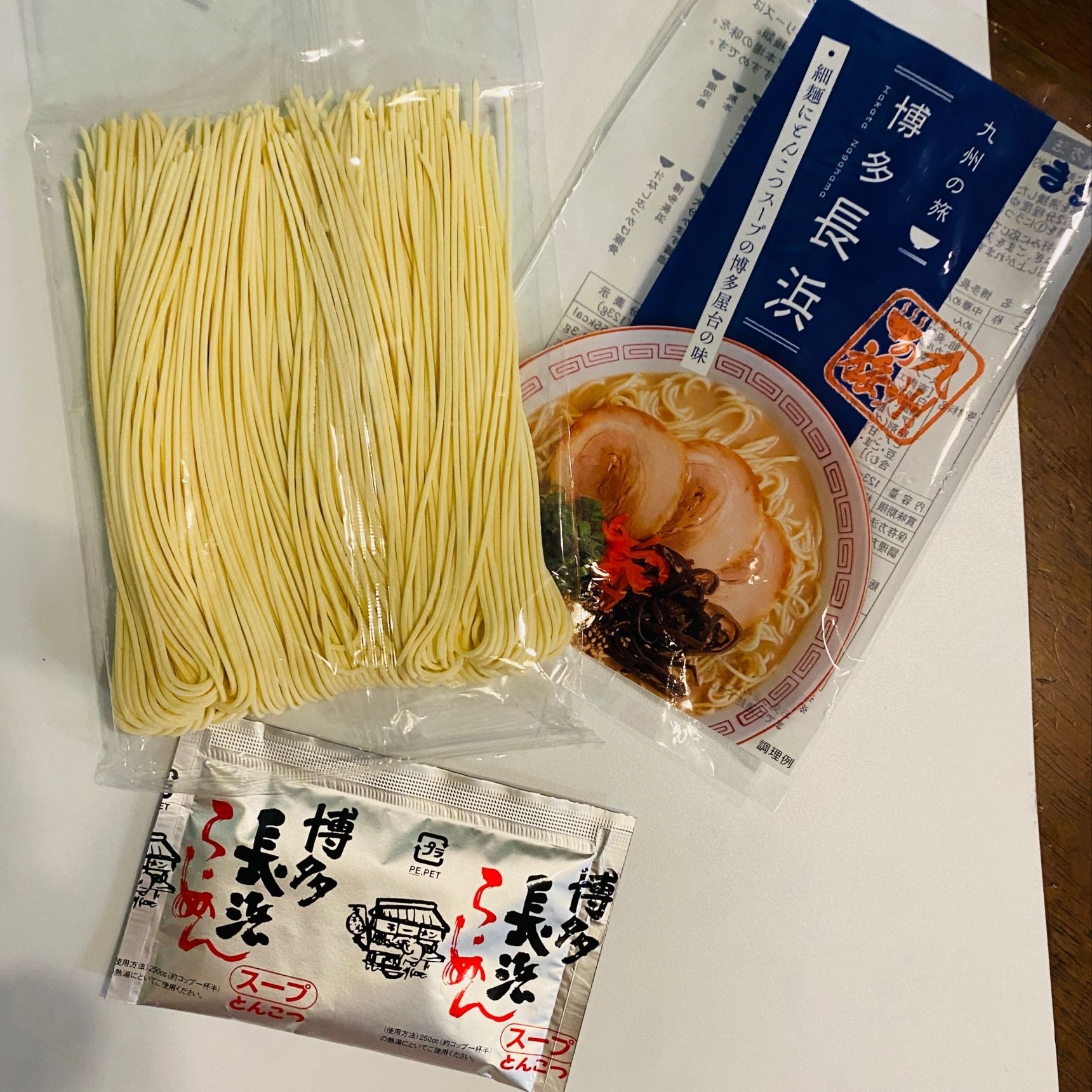 家であるもので、パッケージ通りに作ってみました。 トッピングには、ねぎ、紅生姜、カニカマ、ハム、焼き豚をのせました。 麺は細麺で食べやすく、スープはこってり豚骨で美味しいです。