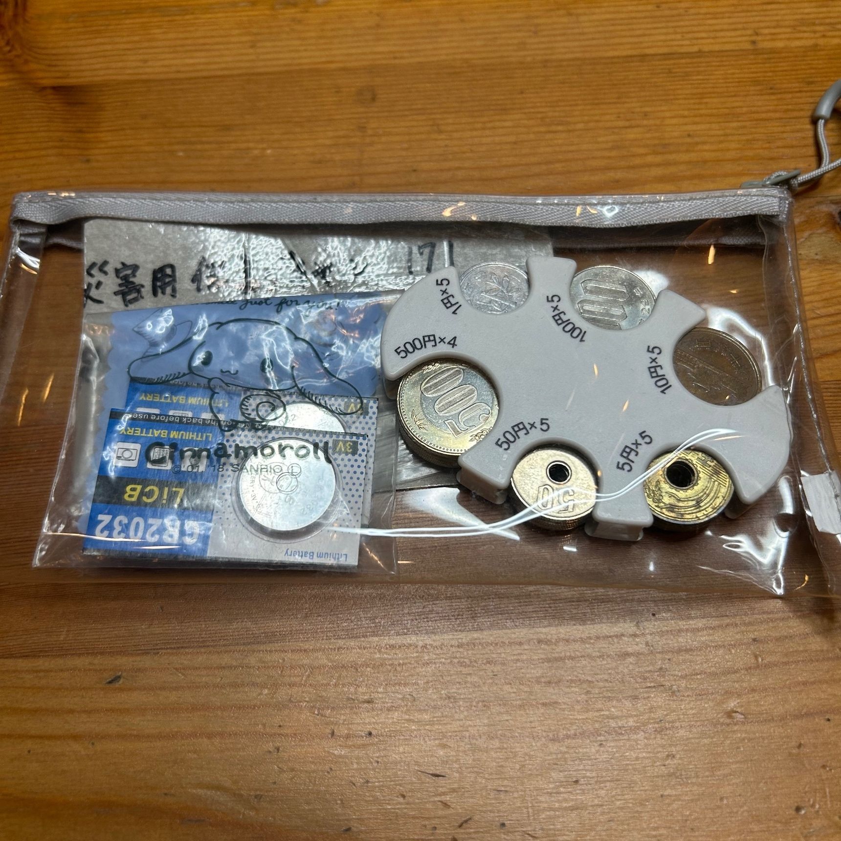 避難用品として、家族の電話番号や災害伝言ダイヤルの記載したメモと、ミニ懐中電灯のボタン電池、それからこのコインホルダーをポーチに忍ばせています。