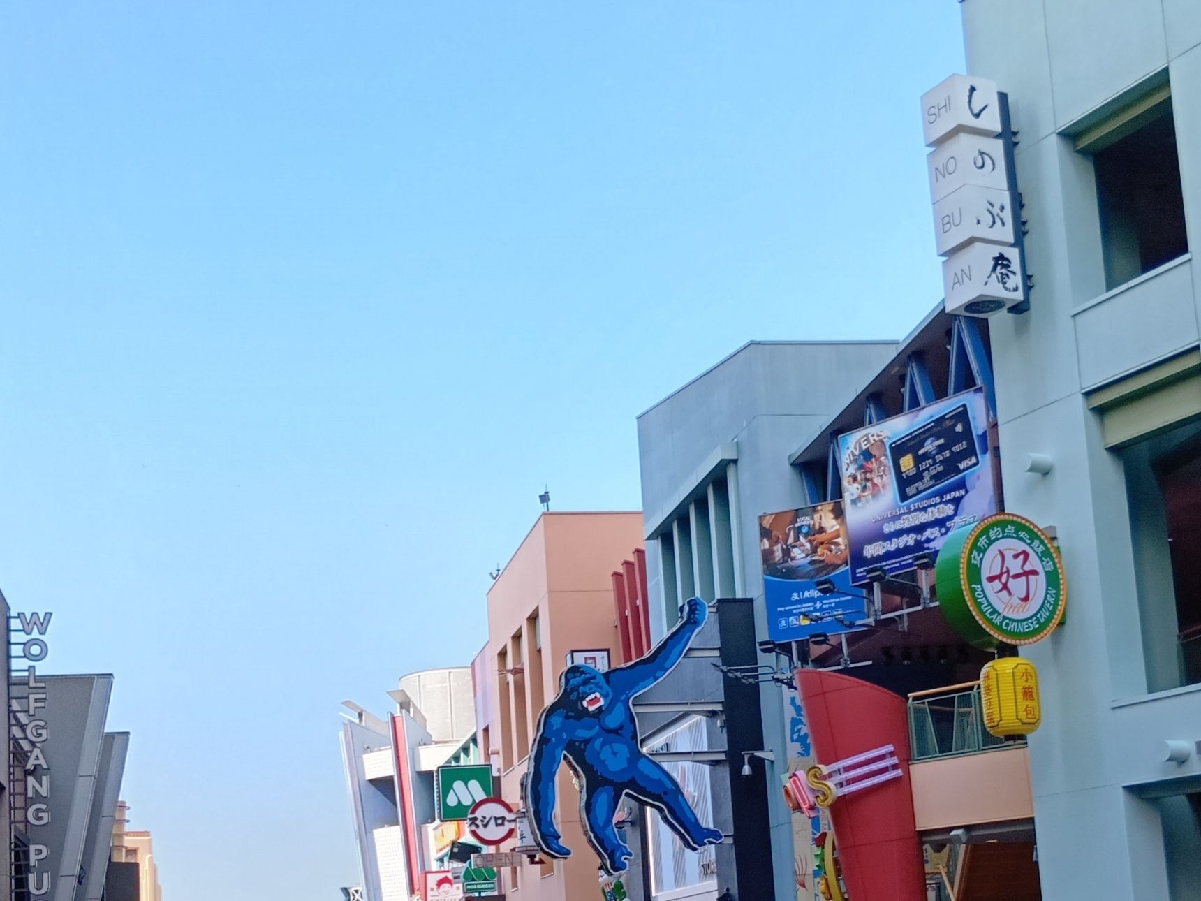 画像は、ユニバーサル・シティウォーク大阪の看板を撮影したものですが、よく目立つ、青いゴリラの看板近くにリトル大阪はありますよ!