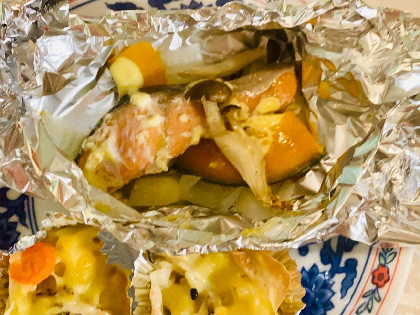 アルミホイルを適当な大きさに切ります。 スライスした玉ねぎ、かぼちゃ、手で割いたしめじ鮭の切り身を入れます。 白ワインをふりかけ、塩胡椒します。マヨネーズをかけて、180度のオーブンで20分ぐらい焼きます。 焼き上がり時間は調整してください。