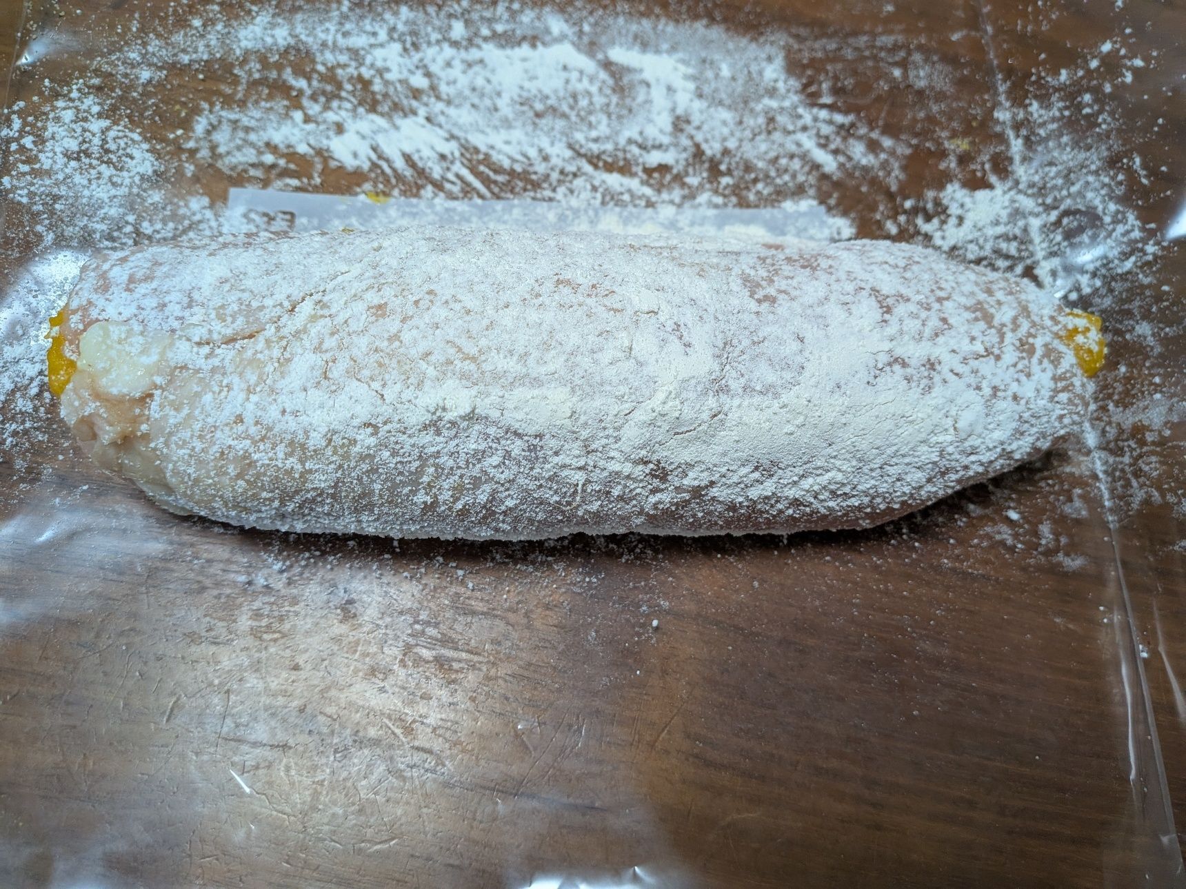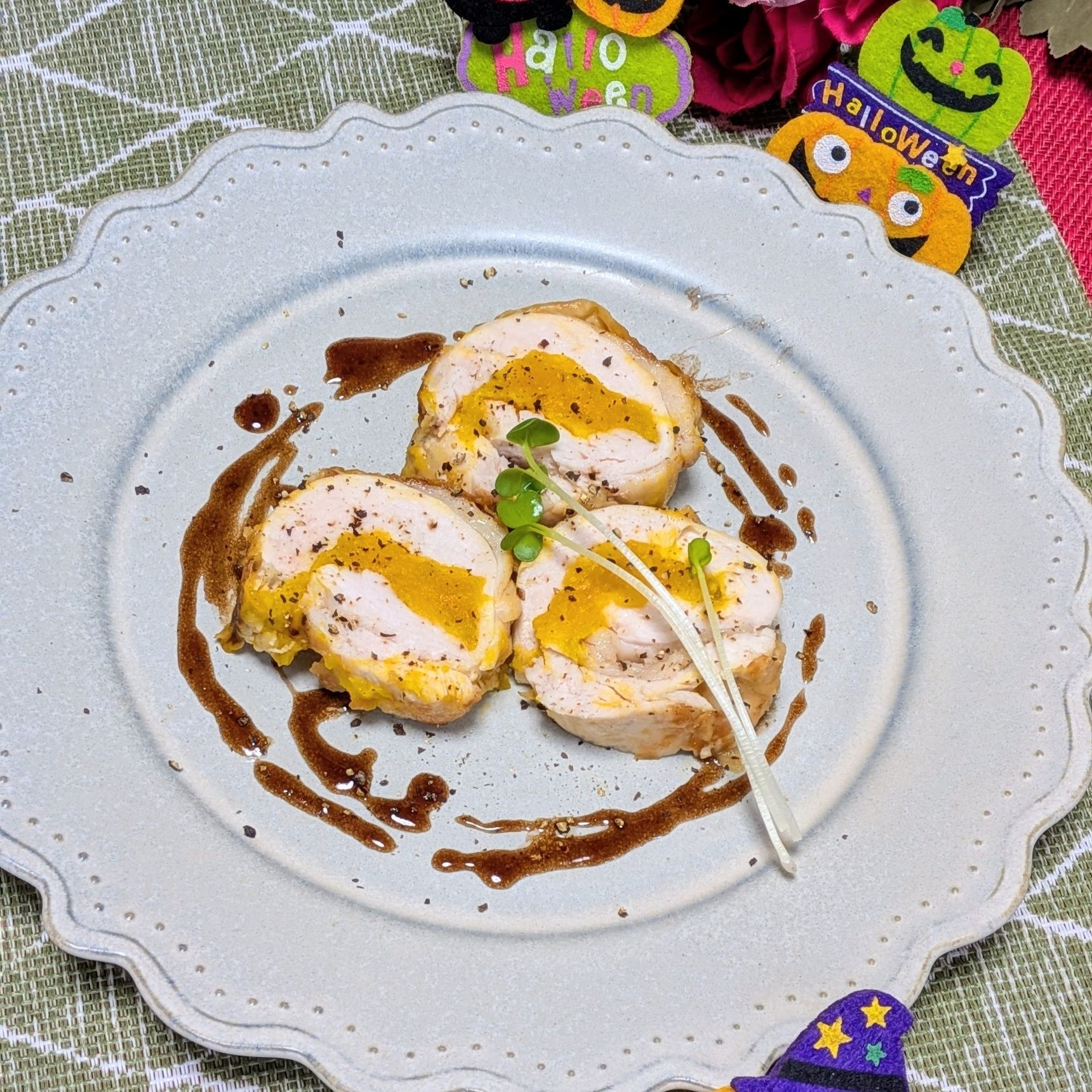 かぼちゃと片栗粉を混ぜ合わせ、棒状に丸めておきます。鶏むね肉の真ん中に置き、手前から巻きます。巻終わりを爪楊枝で刺して外れないようにします。