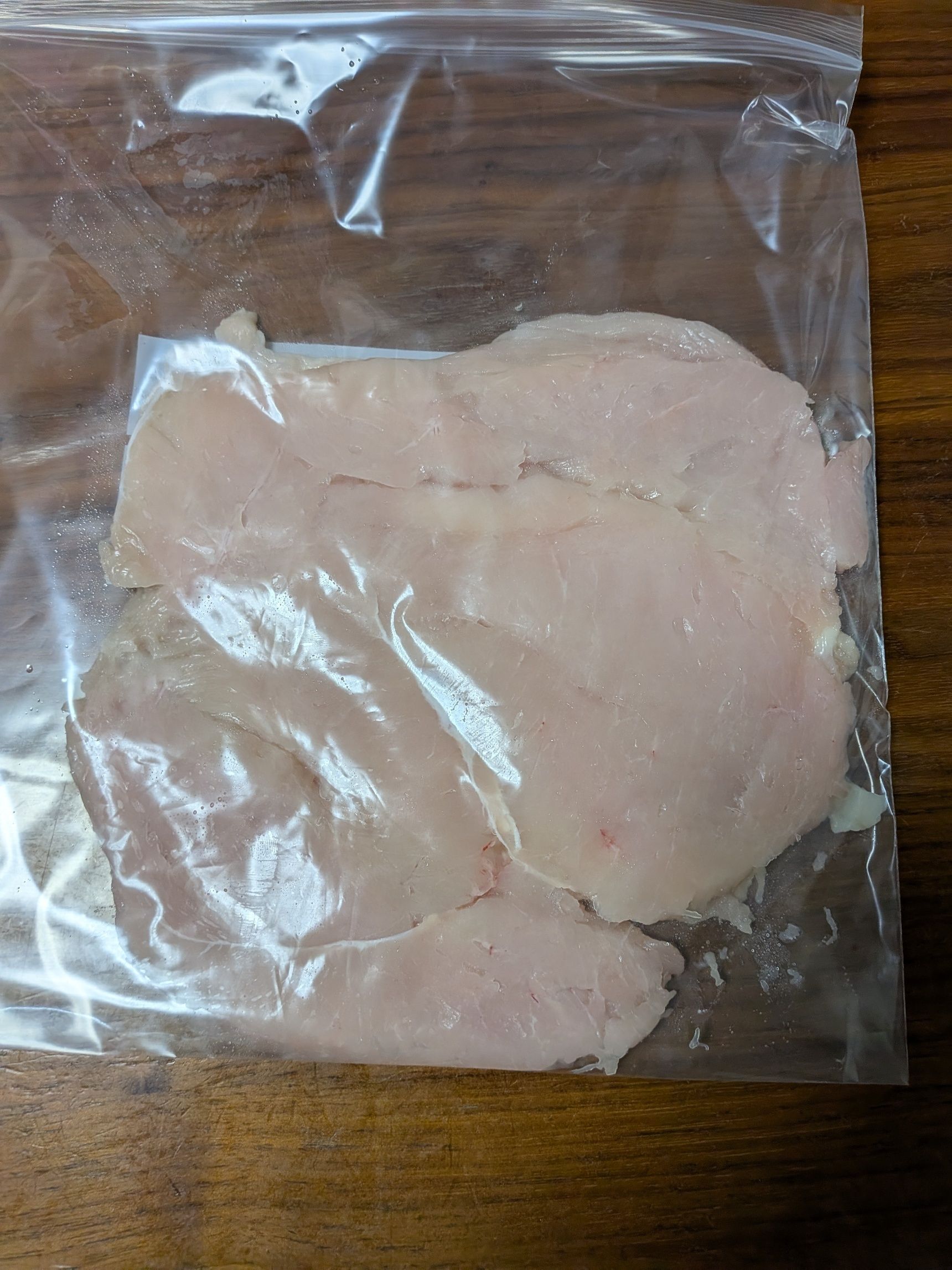 1.ジップロックの中に観音開きをした鶏むね肉を入れ、綿棒で叩いて伸ばします。