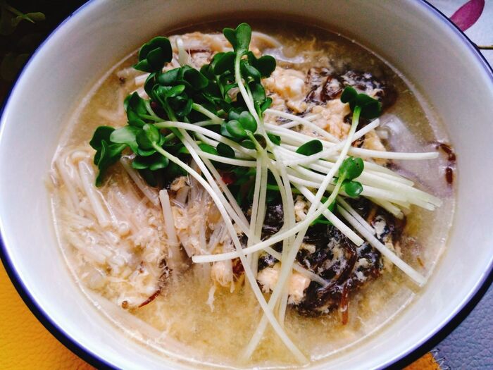 1.鍋に水を入れて中火にかけ、沸騰したらえのきともずく、Aを入れる