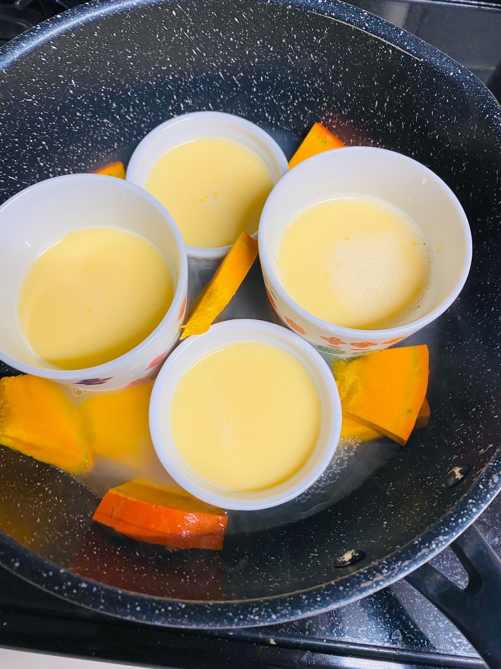 ②プリン液を作ります。卵1個に対して牛乳100cc、砂糖大さじ1~2を混ぜます。裏ごしして容器に入れ、鍋にお湯を入れ、蓋をし、弱火で10分蒸します。