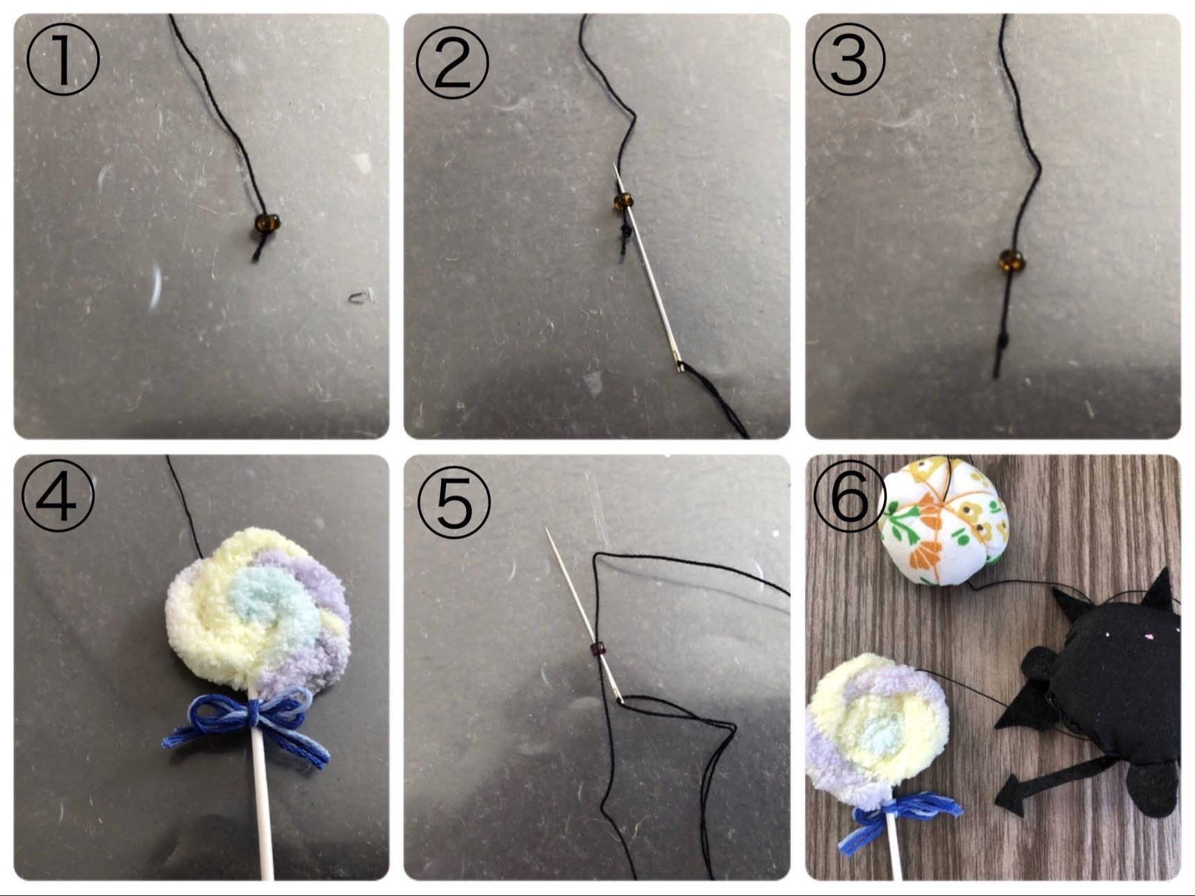 玉結びをし、ビーズを通します。