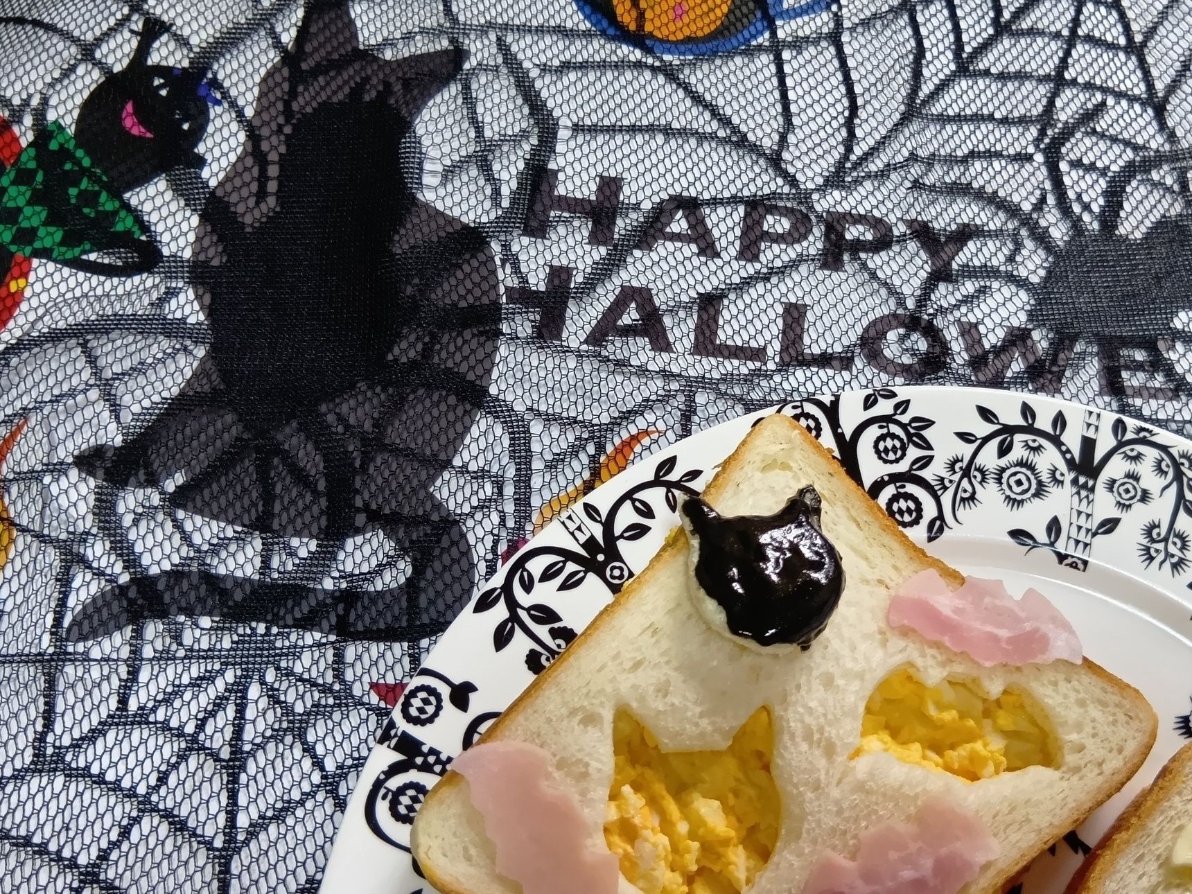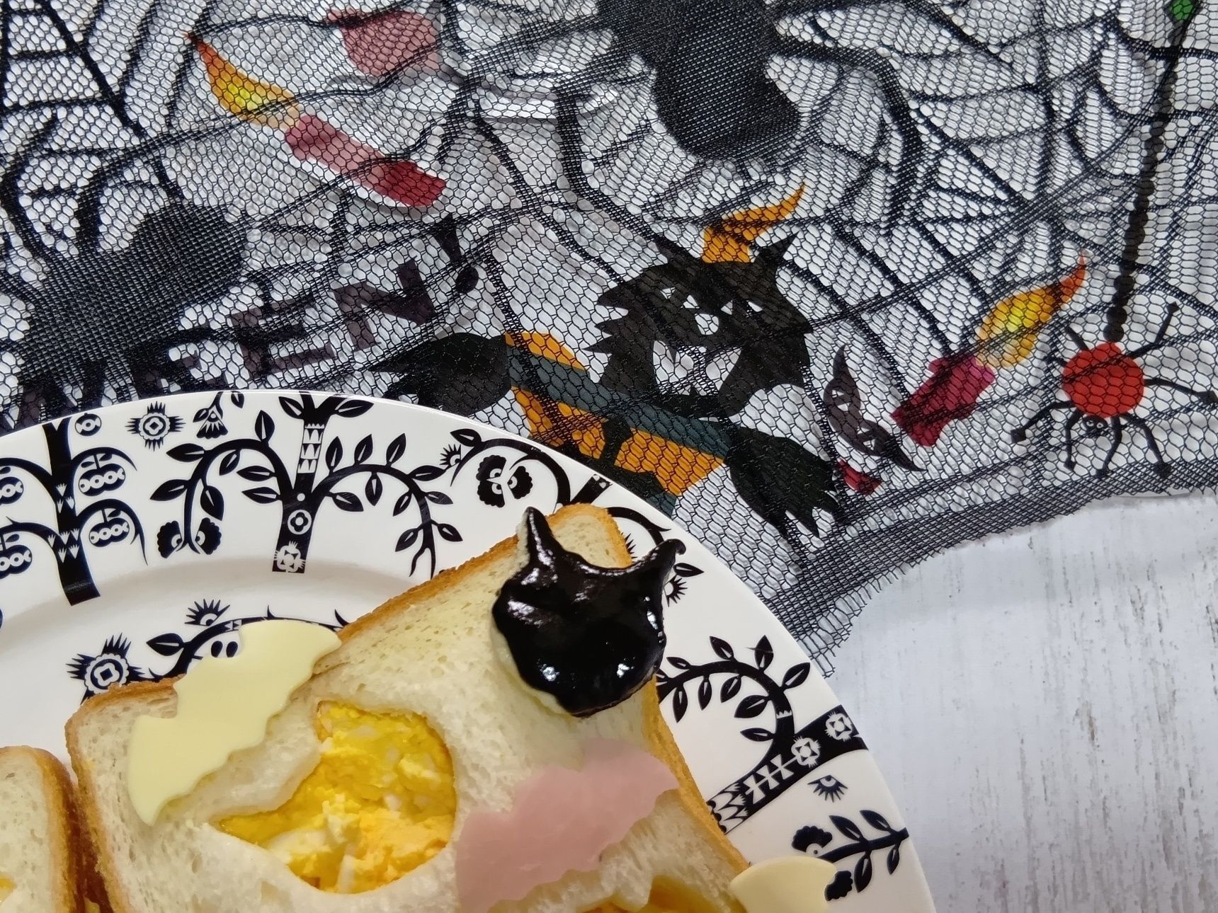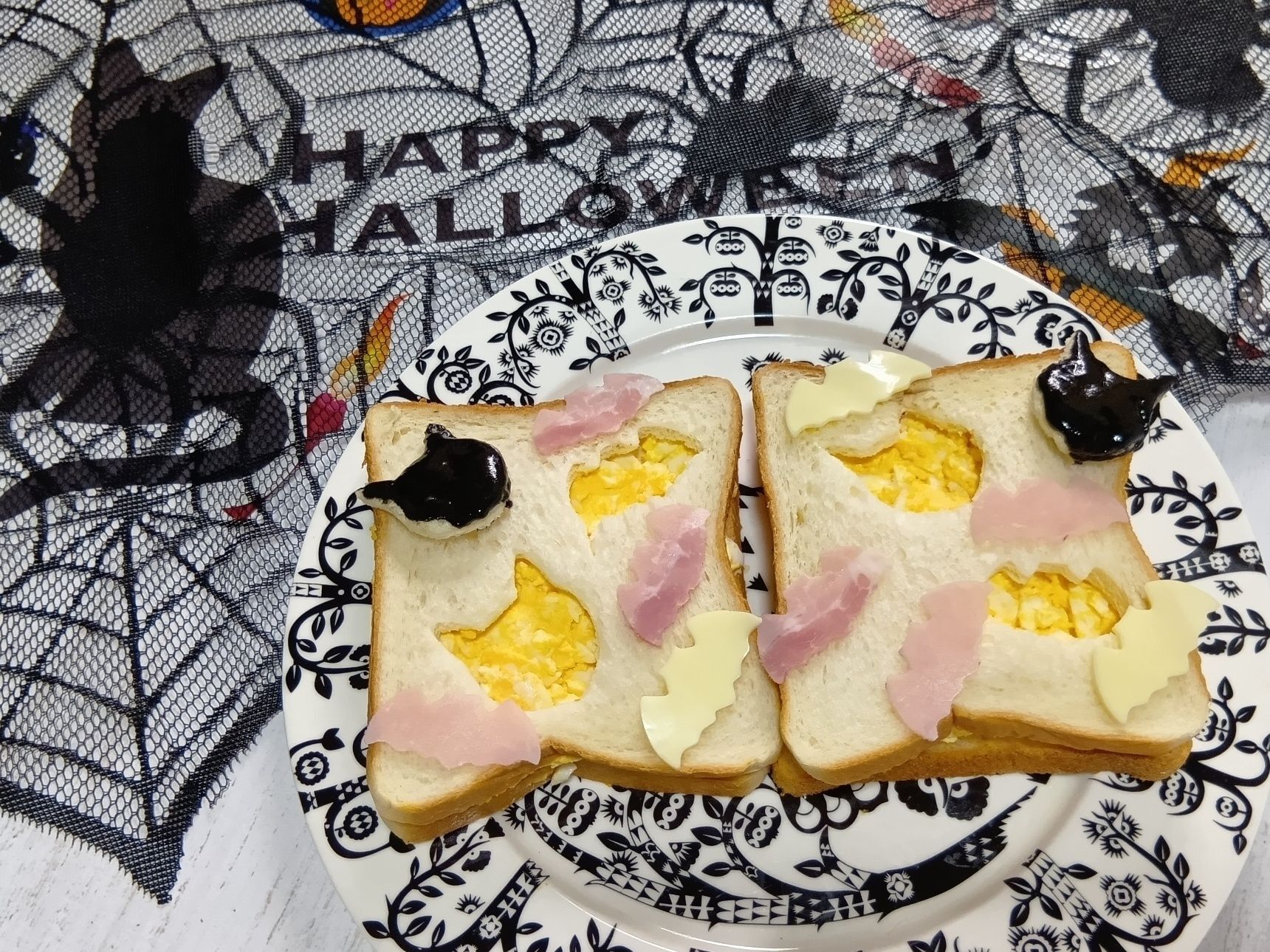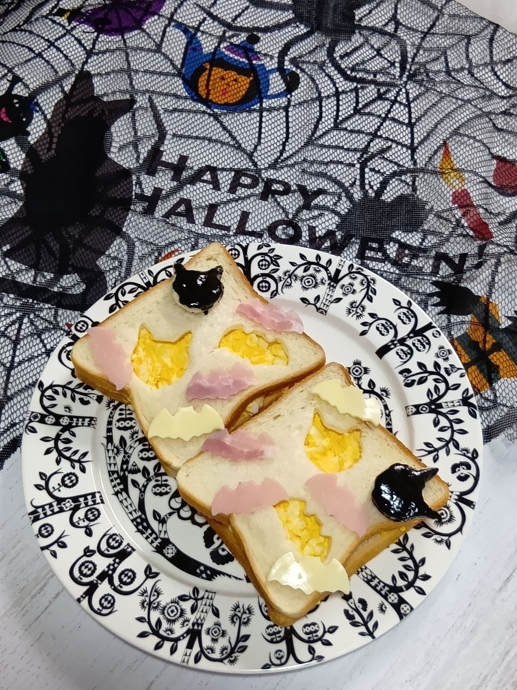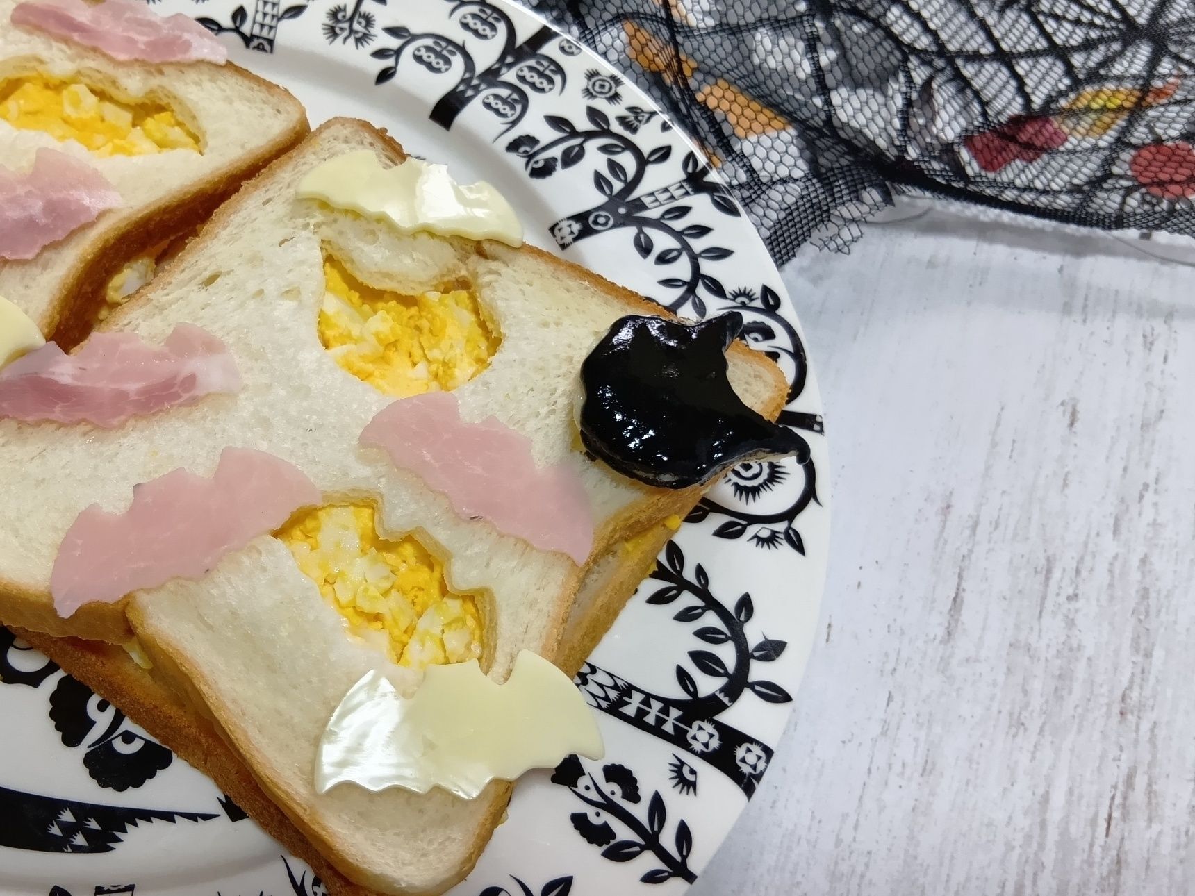 ⑧ スライスチーズやスライスハムも、こうもりと猫の顔の抜き型で抜き取ります。
