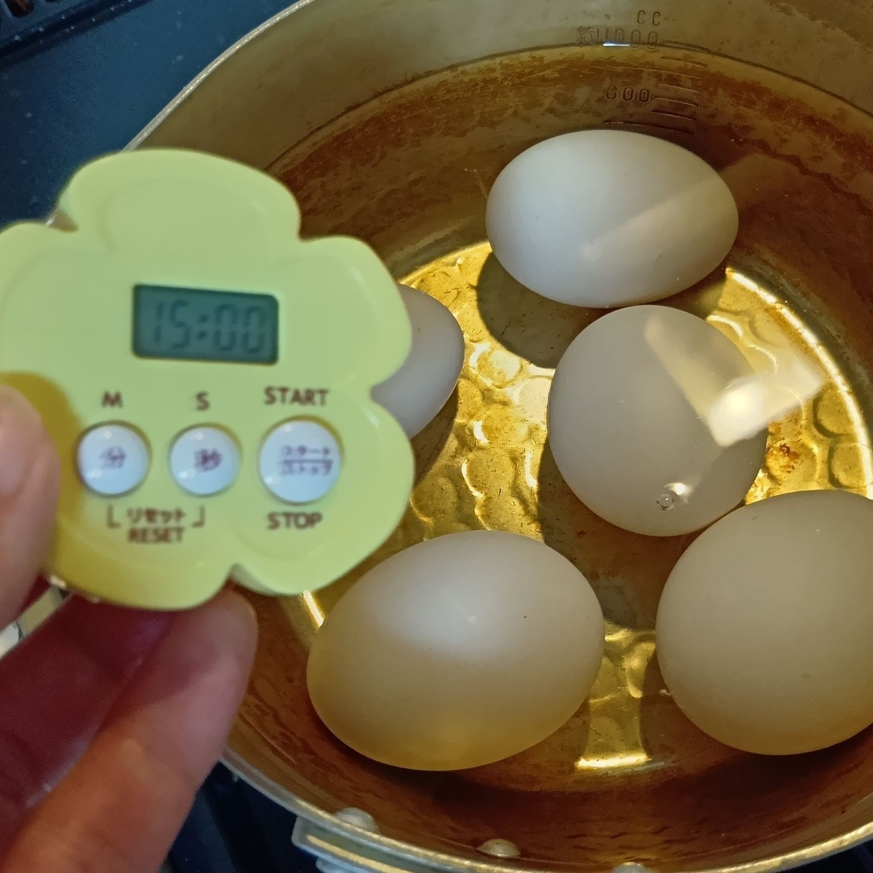 卵は水からゆではじめ、15〜16分ほどゆでる。