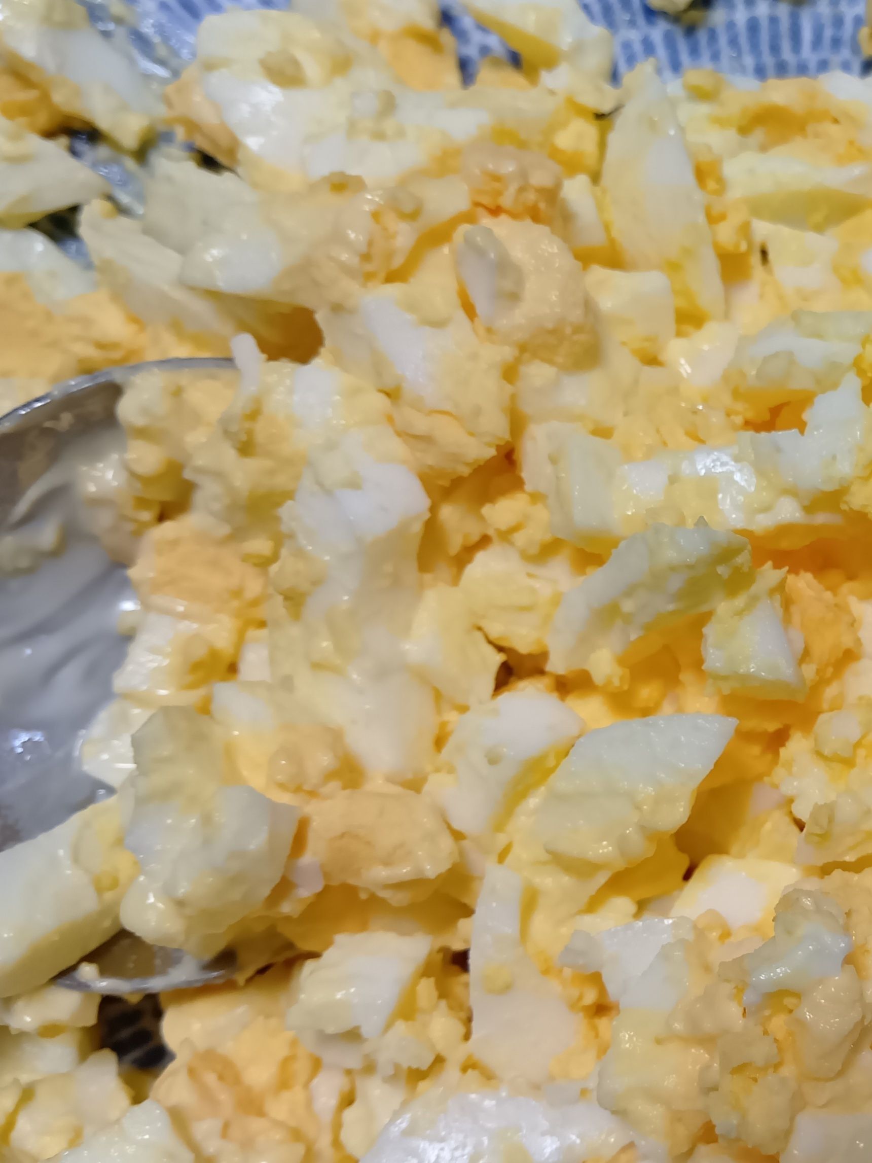 マヨネーズを加え、フォークでやさしく混ぜながら、さらに細かくつぶす。