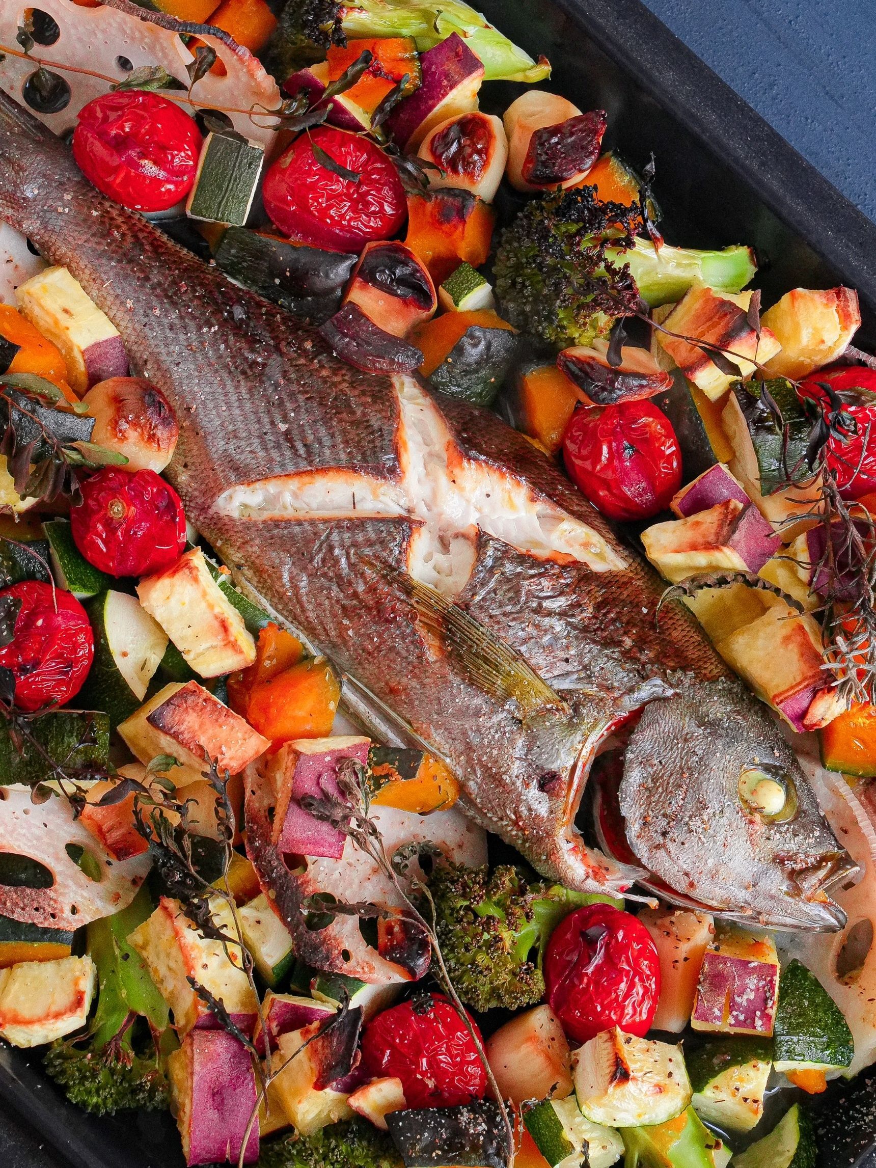 オイルを塗った天板に野菜を広げ、中央にイサキ、隙間にプチトマトとれんこんを配置。上から残りのオリーブオイルを回しかけ、フレッシュハーブをのせる。